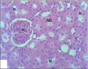 Fig. 7. Section of mouse kidney fed with 2 mg/kg Lorazepam showing congestion (cc), tubular necrosis (N), necrotic debrites in the tubuli lumen (ND) and cast (c), (H and E, ×400).