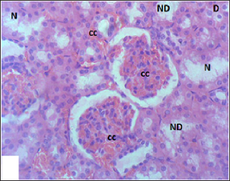 Fig. 8. Section of mouse kidney fed with 3 mg/kg Lorazepam showing marked congestion (cc), tubular and cellular necrosis (N), necrotic debrites in the tubuli lumen (ND) and degenerated cells (D), (H and E, ×400).