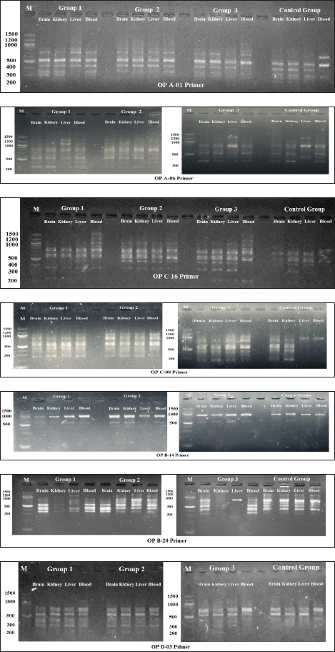 Fig. 9. Shows 1.5% agarose gel electrophoresis of RAPD-PCR profiles of genomic DNA (brain, kidney, liver, and blood) of male albino mice (M. musculus) treated with different Lorazepam concentrations using OP A-01, OP A-06, OP C-16, OP C-08, OP B-14, OP B-20 and OP D-03 primers. Table 2. Physiological parameters of liver and kidney.