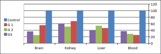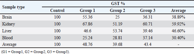 Table 7. Average of GTS% of brain, kidney, liver and blood samples of the male albino mice (M. musculus) exposed to different Lorazepam concentrations.