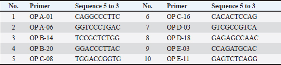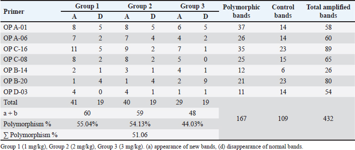 Table 3. Number of control, polymorphic bands (appearance or absence) and polymorphism percent generated by RAPD-PCR profiles of genomic DNA of brain of male albino mice (M. musculus) treated with different Lorazepam concentrations.