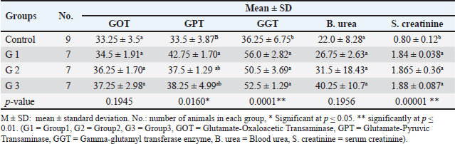 Open Vet. J.. 2024; 14(12): 3219-3231 Open Veterinary Journal, (2024), Vol. 14(12): 3219-3231 Research Article Enhanced inhibitory effects of gamma-aminobutyric acid on renal and hepatic function, molecular profiles, and histological changes in male albino miceMohammed Abdullah Ajeel1* and Israa A. Al-Robaiee21Department of Clinical Laboratory Science, College of Pharmacy, University of Mosul, Mosul, Iraq 2Department of Internal and Preventive Medicine, College of Veterinary Medicine, University of Mosul, Mosul, Iraq *Corresponding Author: Mohammed Abdullah Ajeel. Department of Clinical Laboratory Science, College of Pharmacy, University of Mosul, Mosul, Iraq. Email: Mohammed91 [at] uomosul.edu.iq Submitted: 24/07/2024 Accepted: 24/11/2024 Published: 31/12/2024 © 2024 Open Veterinary Journal