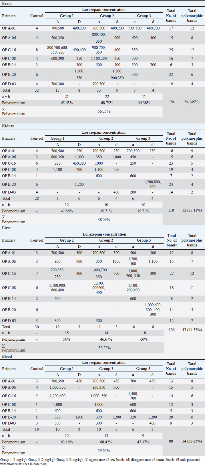 Table 4. The total number of amplified, polymorphic, control and aberrance or absence bands and polymorphism percentage of (brain, kidney, liver, and blood) samples of male albino mice treated with different Lorazepam concentrations.