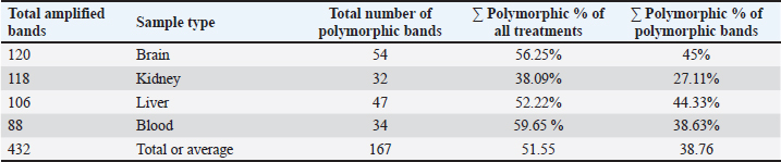 Table 5. The total number of bands and polymorphic bands, polymorphic percent of all treatments of and of polymorphic bands of RAPD-PCR profiles of (brain, kidney, liver and blood) samples of male albino mice (M. musculus) treated with different Lorazepam concentrations.
