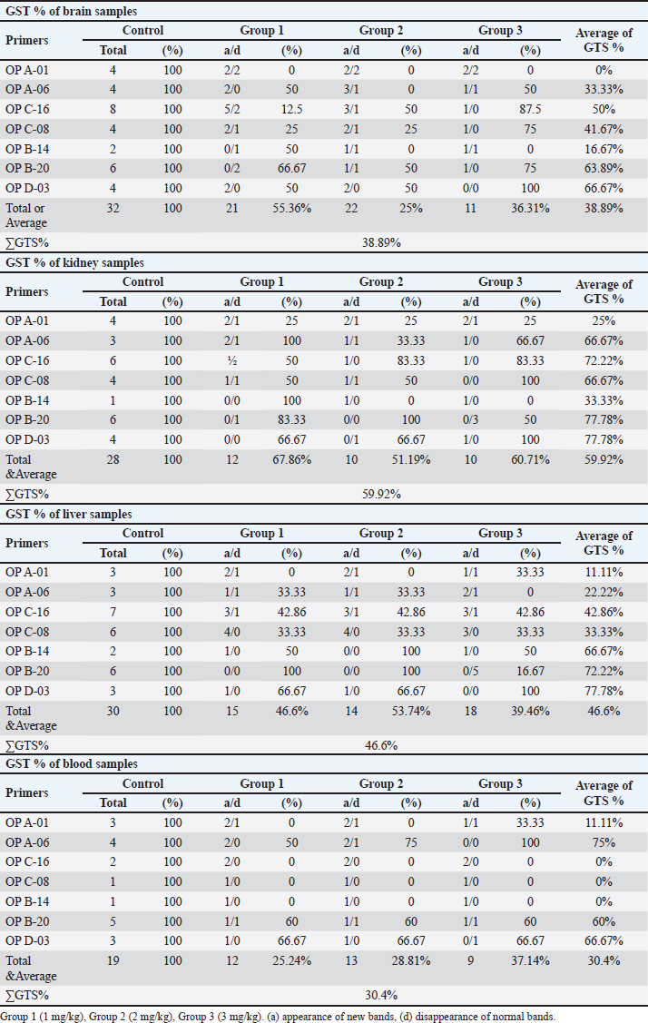 Fig. 10. Changes of GTS% of brain, kidney, liver, and blood samples of the male albino mice (M. musculus) exposed to different Lorazepam concentrations (G1=Group1, G2=Group2, G3=Group3). Morphological changes in liver and kidney tissuesHistopathologically, the livers and kidneys from the BDL group exhibited significant morpho-structural alterations Figures 1–8. Lorazepam-treated mice showed severe congestion, hemorrhage, and hepatocellular degeneration in liver sections with greater severity such as in a dose-limited manner. Such histological changes resemble those reported by Chatila (2000) who also described similar findings in drug-induced liver diseases. Infiltration of immune cells and sinusoidal dilatation are observed, indicating an inflammatory response which is consistent with this idea as independent findings by Dong et al. (2020) correlated these with severe liver injury. Pronounced congestion, tubular necrosis, and intraluminal casts were found in the kidneys. It has been reported that tubular necrosis and obstruction play a critical role in the pathophysiology of AKI (Basile et al., 2012; Kanagasundaram, 2015), which is consistent with markers for acute kidney injury. Histopathology score is dose dependent confirming the relation of the higher dose to more extent of organ damage suggesting toxicity in the form of toxic dose reaction, has been detected in lorazepam. Molecular analysisThe RAPD-PCR analysis showed prominent alterations in the DNA profiles of diverse tissues, reflecting genotoxic (genomic instability) induced by lorazepam. The appearance and disappearance of bands in the RAPD profiles demonstrates DNA damage, as well as possible mutations similar patterns were observed by Atienzar and Jha (2006) using a chemically induced genotoxicity study. Several levels of polymorphism percentages were observed in the different tissues, and a greater number of changes was recorded especially for blood and liver tissue, reflecting possible differences among organs on their susceptibility to oxidative stress or DNA damage. Lorazepam (anxiolytic sedative benzodiazepine), for example, is known to cause oxidative stress that in turn creates reactive oxygen species, and eventually, DNA damage as reported by Aruoma et al. (2006). This study’s results show that lorazepam-related effects are mediated not only by its primary pharmacological targets, but also reflected in genetic polymorphisms with implications on genomic stability and integrity. By enhancing the effect of GABA on its receptors Lorazepam influences not only CNS activity but also affects systems effects directed through neuroimmune and neuroendocrine pathways. This fits with the narrative provided by Möhler (2012), who reviewed wider systemic consequences of changing GABAergic tone. ConclusionThe marked changes in various biochemical, histopathological, and RAPD-PCR profiles indicate that lorazepam-mediated GABA modulation brings about widespread alterations in peripheral organ systems. Taken together, these data suggest caution in the use of lorazepam clinically and potentially represent an unmet need for safer therapeutic alternatives or strategies to limit benzodiazepine-induced organ toxicity. AcknowledgmentMost appreciation to the University of Mosul for providing care for animals in the animal house at the College of Veterinary Science/ and most sincere thanks for the College of Pharmacy for providing the instruments needed in the experiments at the laboratory. Conflict of interestsThe authors declare that there is no conflict of interest FundingThis research received no specific grant and has self-funding support. Authors’ contributionsIsraa A. Al-Robaiee was corresponding for animal care and clinical parameters. Mohammed A. Ajeel was corresponding for the thermal treatment and obtaining the blood samples. Article writing was done equally by both authors. Data availabilityAll data are provided in the manuscript. ReferencesAronson, J.K. 2007. Concentration-effect and dose-response relations in clinical pharmacology. Br. J. Clin. Pharmacol. 63(3), 255–257. Aruoma, O.I., Grootveld, M. and Bahorun, T. 2006. Free radicals in biology and medicine: from inflammation to biotechnology. BioFactors 27(1–4), 1–3. Atienzar, F.A. and Jha, A.N. 2006. The random amplified polymorphic DNA (RAPD) assay and related techniques applied to genotoxicity and carcinogenesis studies: a critical review. Mutat. Res. 613(2–3), 76–102. Bancroft, J.D., Layton, C. and Suvarna, S.K. 2013. Bancroft’s theory and practice of histological techniques, expert consult: online and print, 7: Bancroft’s theory and practice of histological techniques. London, UK: Churchill Livingstone. Basile, D.P., Anderson, M.D. and Sutton, T.A. 2012. Pathophysiology of acute kidney injury. Com. Physiol. 2(2), 1303–1353. Chatila, R. 2000. Hepatotoxicity: the adverse effects of drugs and other chemicals on the liver. J. Clin. Gastroenterol. 118(5), 984–985. Corsini, A. and Bortolini, M. 2013. Drug-induced liver injury: the role of drug metabolism and transport. J. Clin. Pharmacol. 53(5), 463–474. Di Lazzaro, V., Oliviero, A., Meglio, M., Cioni, B., Tamburrini, G., Tonali, P. and Rothwell, J.C. 2000. Direct demonstration of the effect of lorazepam on the excitability of the human motor cortex. Clin. Neurophysiol. 111(5), 794–799. Di Lazzaro, V., Oliviero, A., Saturno, E., Dileone, M., Pilato, F., Nardone, R., Ranieri, F., Musumeci, G., Fiorilla, T. and Tonali, P. 2005. Effects of lorazepam on short latency afferent inhibition and short latency intracortical inhibition in humans. J. Physiol. 564(Pt 2), 661–668. Dong, V., Nanchal, R. and Karvellas, C.J. 2020. Pathophysiology of acute liver failure. Nutr. Clin. Pract. 35(1), 24–29. Erdö, S.L. 1985. Peripheral GABAergic mechanisms. Trends Pharmacol. Sci. 6, 205–208. Goss, R.J., 1965. Kineticks of compensatory growth. Q. Rev. Biol. 40, 123–146. Hermans, S.M., Buckley, H.L. and Lear, G. 2018.