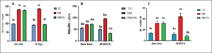 Fig. 1. A: Effect of olive leaf extract on Serum glucose level in induced diabetic adult male rats. B: Effect of olive leaf extract on Serum insulin level in induced diabetic adult male rats. C: Effect of olive leaf extract on Serum insulin resentence in induced diabetic adult male rats. Data represented as mean ± SEM. * The differences between groups throughout time are denoted by capital letters. * The differences between the two time periods are denoted by the use of lowercase letters. * Data represented as mean ± SE N=10 per group. Table 1. Effect of diabetes and olive leaves extract on MDA (ng/ml) in brain tissue of adult male rats.