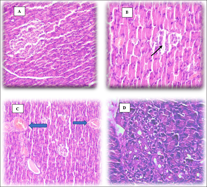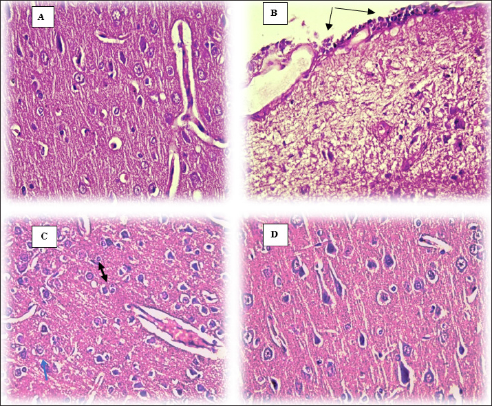 Fig. 3. Brain histology of rats following 40 days (H&E stain, 40×). (A) Control group (CC). (B) Diabetic group DM. (C) DM group. (D) DM+OL group. Sections of the brain show damaged brain cells in DM rats, the free radical theory suggests mitochondrial oxidative damage, particularly irreversible damage, causes aging and cellular malfunction, leading to neurological and cognitive diseases due to their vulnerability. Damage repair after supplementation with OLS. As mentioned, olive leaf supplements act as a neuroprotective (Pourkhodadad et al., 2016), by minimizing the effects of age and free radicals on the central nervous system, improving nerve transmission, and shielding nerve cells from oxidative stress. ConclusionThe present data demonstrate that OLS administration decreased oxidative stress MDA and increased antioxidant agent GSH, acted as neuroprotective by increased (DOP) and (AchE) in brain tissue in diabetic rats. AcknowledgmentsThe authors would like to acknowledge College of Veterinary Medicine/University of Baghdad for providing the facilities to perform this project. Conflict of interestThe authors declare that there is no conflict of interest. FundingThis research received no external funding. Authors’ ContributionsConceptualization and design: SA; Practical work: SA and AA; formal analysis and interpretation of data: SA, AA; writing-original draft preparation: SA and AA; All authors revised and approved the final manuscript for publication. Data availabilityAll data supporting the findings of this study are available within the manuscript and no additional data sources are required. ReferencesAbd El-Rahman, H. 2016. The effect of olive leaf extract and Α-Tocopherol on nephroprotective activity in rats. J. Nutr. Food Sci. 6, 479. Abbas, A.B. and Abbas, D.A. 2018. Evaluation of lipid profile and inflammatory parameters in female diabetes type 2 induced rabbits treated with glimepride, bromocriptine and fluoxtein. Iraqi J. Vet. 42(2), 97–104. Abdulghafoor, H.A., Ramadhan, S.J. and Nawfal, A.J. 2021. Therapeutic effects of allicin against the diabetes mellitus induced by streptozotocin in male rats. NVEO 8934–8945. Acar-Tek, N. and Ağagündüz, D. 2020. Olive leaf (Olea europaea L. folium): potential effects on glycemia and lipidemia. ANM. 76(1), 10–15. Ahamad, J., Toufeeq, I., Khan, M.A., Ameen, M.S.M., Anwer, E.T., Uthirapathy, S., Mir, Sh.R. and Ahmad, J. 2019. Oleuropein: a natural antioxidant molecule in the treatment of metabolic syndrome. Phytother. Res. 33(12), 3112–3128. Albasher, G., Albrahim, T., Alsultan, N., Alfaraj, S., Alharthi, M.S., Kassab, R.B. and Abdel Moneim, A.E. 2020. Red beetroot extract mitigates chlorpyrifos-induced reprotoxicity associated with oxidative stress, inflammation, and apoptosis in rats. ESPR 27, 3979–3991. Arnal, E., Miranda, M., Barcia, J., Bosch-Morell, F. and Romero, F. 2010. Lutein and docosahexaenoic acid prevent cortex lipid peroxidation in streptozotocin-induced diabetic rat cerebral cortex. Neurosci. J. 166(1), 271–278. Arora, A., Nair, M.G. and Strasburg, G.M. 1998. Structure–activity relationships for antioxidant activities of a series of flavonoids in a liposomal system. Free Radic. Biol. Med. 24(9), 1355–1363. Bansal, R. 2002. Alloxan and streptozotoan action. Acta Diabetol. Lat. 17, 214. Bădescu, S., Tătaru, C., Kobylinska, L., Georgescu, E., Zahiu, D., Zăgrean, A. and Zăgrean, L. 2016. The association between diabetes mellitus and depression. J. Med. Life 9(2), 120–125. Baydas, G., Canatan, H. and Turkoglu, A. 2002. Comparative analysis of the protective effects of melatonin and vitamin E on streptozocin-induced diabetes mellitus. J. Pineal Res. 32(4), 225–230. Bhupatiraju, L., Bethala, K., Goh, K. W., Dhaliwal, J. S., Siang, T. C., Menon, S., Menon, B., Anchu, K.B., Chan, S.Y., Ming, L.C. and Khan, A. 2023. Influence of Murraya koenigii extract on diabetes induced rat brain aging. J. Med. Life 16(2), 307–316. Biessels, G.-J., Kappelle, A., Bravenboer, B., Erkelens, D. and Gispen, W. 1994. Cerebral function in diabetes mellitus. Diabetologia 37, 643–650. Boaz, M., Leibovitz, E., Dayan, Y.B. and Wainstein, J. 2011. Functional foods in the treatment of type 2 diabetes: olive leaf extract, turmeric and fenugreek, a qualitative review. Funct. Food Health Dis. 1(11), 472–481. Boye, A., Barku, V.Y.A., Acheampong, D.O. and Ofori, E.G. 2021. Abrus precatorius leaf extract reverses alloxan/nicotinamide-induced diabetes mellitus in rats through hormonal (Insulin, GLP-1, and glucagon) and enzymatic (α-amylase/α-glucosidase) modulation. Biomed Res. Int. 2021, 9920826. Butt, M.S., Tariq, U., Naz, A. and Rizwan, M. 2021. Neuroprotective effects of oleuropein: recent developments and contemporary research. J. Food Biochem. 45(12), e13967. Cobley, J.N., Fiorello, M.L. and Bailey, D.M. 2018. 13 reasons why the brain is susceptible to oxidative stress. Redox. Biol. 15, 490–503. Cui, X.P., Li, B.Y., Gao, H.Q., Wei, N., Wang, W.l. and Lu, M. 2008. Effects of grape seed proanthocyanidin extracts on peripheral nerves in streptozocin-induced diabetic rats. J. Nutr. Sci. Vitaminol. 54(4), 321–328. De Bock, M., Derraik, J.G., Brennan, C.M., Biggs, J.B., Morgan, P.E., Hodgkinson, S.C., Hofman, P.L. and Cutfield, W.S. 2013. Olive (Olea europaea L.) leaf polyphenols improve insulin sensitivity in middle-aged overweight men: a randomized, placebo-controlled, crossover trial. PLoS One 8(3), e57622. Forrester, T.E., Badaloo, V., Bennett, F.I. and Jackson, A.A. 1990. Excessive excretion of 5-oxoproline and decreased levels of blood glutathione in type II diabetes mellitus. Eur. J. Clin. Nutr. 44(11), 847–850. Ghareeb, D.A. and Hussen, H.M. 2008. Vanadium improves brain acetylcholinesterase activity on early stage alloxan-diabetic rats. Neurosci. Lett. 436(1), 44–47. Goldstein, A.S., Janson, B.J., Skeie, J.M., Ling, J.J. and Greiner, M.A. 2020. The effects of diabetes mellitus on the corneal endothelium: a review.