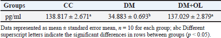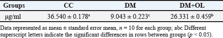 Table 2. Effect of diabetes and olive leaves extract on GSH (μg/ml) in brain tissue of adult male rats.