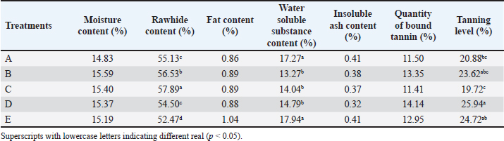 Ethical approvalThis study did not use animals directly; it only used dried salt-preserved goat skin, and the sensory analysis was only visual; therefore, there was no ethical approval. ResultsPhysical characteristics of gambier-tanned goat leatherThe analysis results for gambier-tanned goat leather demonstrate that the dehairing process using different immersion times in rumen fluid IMO affects the pulling strength and elongation. However, there was no influence on the cracking strength Table 1. The longer the soaking time, the gambier-tanned goat leather in the rumen fluid IMO solution increases the dragging strength and decreases the gambier-tanned goat leather elongation. Table 1 shows that the average tensile strength test with the treatments of adding IMO had the highest soaking time in treatment D (three days soaking), while the lowest tensile strength was found in treatment A (control). This standard is based on the SNI (1989b), with a minimum standard of 75 kg/cm2. The subsequent Duncan’s test analysis revealed that treatment A exhibited statistically significant differences compared with treatments C and D. However, no substantial disparities were observed between treatments A, B, and E. The average mark test revealed that the highest elongation of gambier-tanned goat leather was observed in treatment A (control). Meanwhile, the lowest tensile strength was observed in treatment E (4 days). Duncan’s test results showed that treatment A exhibited significant differences compared with treatments B, C, D, and E. Crack resistance (mm)/Zwik power with the addition of rumen fluid IMO against the old immersion range between 6.03 and 6.75 mm. Chemical characteristics of gambier-tanned goat leatherGambier-tanned goat leather shows its diverse influence on raw substance skin, grade substances late in water, and degree of tanning. However, no significant effect was observed, ash fat levels were not dissolved, and tannin was bound to Table 2. The average moisture content of vegetable tanning, with the addition of rumen fluid IMO, during the dehairing of goat leather was 14.83%–15.59%. The difference in the addition of IMO to the moisture content was influenced by the condition of the leather itself, where each treatment had the same ability to hydrolyze globular proteins, most of which were left only fiber proteins (collagen), where this collagen tissue did not bind much water. The average fat content of vegetable tanning with the addition of rumen fluid IMO during dehairing of goat skin was the highest in treatment E, 1.04%, and the lowest in treatment A, 0.86%. Water-soluble substance levels are a way to determine the amount of tannin that is not bound or filled too much with objects easily dissolved in water in the tanned leather. The highest levels of water-soluble substances were observed in treatment E, whereas the lowest levels were observed in treatment B. Duncan’s further test results showed that the levels of soluble substances in vegetable tanning water with gambier in treatment A (control) were significantly different from those in treatments B, C, and D but not significantly different from those in treatment E. The high levels of soluble substances in treatment E, with an average of 17.94%, were influenced by the duration of hide immersion in IMO-enriched rumen fluid during the depilation phase, causing the skin tissue structure to be more open but damaged by microbes so that the tanning agent that entered had not penetrated properly to form bonds with collagen fibers in goat skin so that some tannin content in gambier did not bind to the leather and dissolved into water. Gambier-tanned goat leather’s average insoluble ash content was 0.32%–0.41%. The average level of bound tannin in vegetable tanning with the addition of rumen fluid during dehairing was 11.41%–14.14%. The insignificant effect of the bound tannin level is due to the sum of the water, rawhide, fat, seawater, and insoluble ash levels, which were statistically the same. The tanning degree of gambier-tanned goat leather was 19.72%–25.94%. Duncan’s further test results showed that the degree of tanning in vegetable tanning with gambier treatment A (control) was not significantly different from treatments B, C, and E but was significantly different from treatment D. Table 2. Chemical properties of gambier-tanned goat leather.