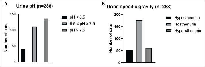 Fig. 1. Frequency distribution of (A) urine pH and (B) USG in 288 male cats diagnosed and treated for UO at the Veterinary Teaching Hospital, FMVZ, UNESP, Botucatu, São Paulo, from 2010 to 2020.