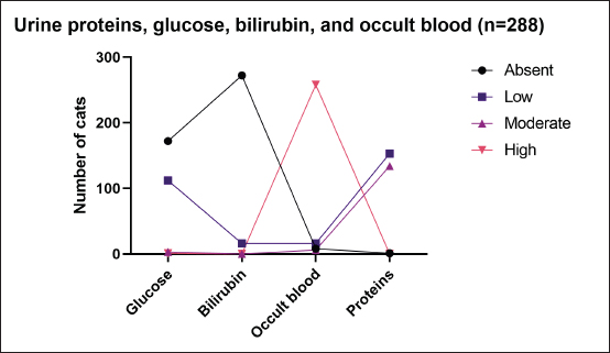 Fig. 2. Frequency distribution of glucose, bilirubin, occult blood, and protein in the urine of 288 male cats diagnosed and treated for UO at the Veterinary Teaching Hospital, FMVZ, UNESP, Botucatu, São Paulo, from 2010 to 2020. Regarding the low adherence of urine samples sent for analysis, it is mainly related to the non-collection of urine samples on the first day of presentation to the emergency room. In order to maintain some consistency in the findings of this study, only urinalysis performed from samples collected on the first day were considered. Therefore, samples collected after any medical intervention were not included, explaining the 30.56% rate. Similarly, the low rate of positive urine culture may have been influenced by the exclusion of urine culture performed on any other day rather than the first day of presentation. Besides the small number of animals with urine culture performed on the first day of presentation, the most commonly isolated microorganisms, E. coli and Staphylococcus spp. are somehow, in agreement with previous studies (Dorsch et al., 2014; Teichmann-Knorm et al., 2018). In this study, although a similar proportion of isolates were found for both microorganisms, different results could have been found if a higher number of animals had urine culture performed in the first day of presentation. Considering that E. coli and Staphylococcus spp. were the bacteria most commonly isolated in equal proportions in this study, it contrasts with previous studies where E. coli was the predominant pathogen (Gerber et al., 2005; Litster et al., 2007; Dorsch et al., 2014). In culture-positive cats, the prevalence of E. coli isolation ranged from 39% to 59% (Dorsch et al., 2019), which was higher than our findings. In both human and animal UTIs, E. coli is the most frequently identified microorganism (Chapman et al., 2006). Escherichia coli strains from phylogenetic group B2 are known for their extraintestinal virulence, including UTIs (Clermont et al., 2000), which may explain the presence of E. coli in obstructed cats with UTIs (Dorsch et al., 2014), as identified in this study. In contrast, Enterococcus spp., a commonly cited UTI isolate, was not found in this study. When positive and negative urine cultures from cats were compared with bacteria in the urinary sediment, no correlation was detected between the two tests. These findings underscore the importance of urine culture as the gold standard for detecting subclinical bacteriuria and UTIs, especially when clinical signs are absent. Subclinical bacterial infections are a common concern and are attributed to the indiscriminate use of antimicrobials in both humans (Cortes-Penfield et al., 2017) and animals (Weese et al., 2019).