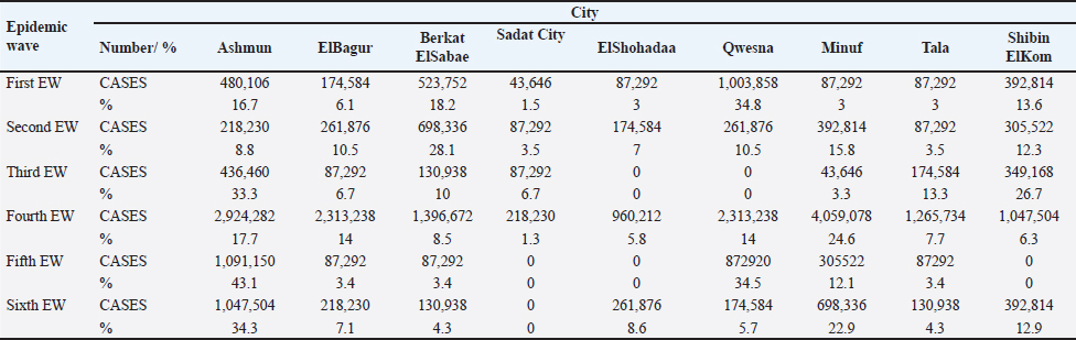 where: SD is the standard distance Dm is the median distance n is the number of points if no population field is used, or if a population field is supplied, n is the sum of the population field values. Kernel density maps for the total number of cases were plotted for each EW to visualize the risk for the disease. Default cells and the output were selected in Square kilometers (Km2). Clustering, defined as an aggregation of diseases within specific spatial and temporal dimensions beyond what could be anticipated, is a fundamental concept in epidemiological analysis (Porta, 2014). Retrospective space-time permutation scan statistics were performed to detect the Spatio-temporal clusters for each EW by investigating whether the outbreaks were interrelated in space and time using (SaTScan 8.2.1 software) (Kulldorff et al. 2005; Onozuka and Hagihara, 2008; Kulldorff, 2010). The scanning window was a cylinder with the spatial and temporal dimensions as circular base and height, respectively. The temporal scanning window was set to <50% of the study period in each EW and a maximum of 50% of outbreaks were allowed in the spatial scanning window (Zhang et al., 2012). The likelihood ratio statistic was used to evaluate the possibility of a true spatiotemporal cluster in a window. The window with the maximum likelihood ratio statistic was considered the primary cluster while the remainder was considered the secondary cluster. Their statistical significance was tested through Monte Carlo simulations of 999 replications (Zhang et al., 2012). The time units of day, week, and month were used, respectively. ArcGIS 10.5 software was used to overlay results from different methods in a map for visual comparisons (ESRI, Redlands). Ethical approvalNot needed for this study. ResultsTemporal distribution of HPAI H5N1 outbreaks in Menofia governorate, EgyptThroughout the study period encompassing 2006 to 2017, six distinct epidemic waves (EW1-6) of H5N1 outbreaks were discerned, as illustrated in Figure 1. The first epidemic wave (first EW) commenced in February 2006, persisted for approximately 3 months, and encompassed 66 reported outbreaks. This initial wave reached its peak in mid-March 2006, subsequently abating in May 2006. The second epidemic wave (second EW) unfolded on November 21, 2006, and exhibited its peak in December of the same year, culminating in mid-April 2007. Notably, this wave spanned 4 months and comprised an estimated 57 outbreaks. Progressing to the third epidemic wave (third EW), the Menofia governorate encountered 30 outbreaks, spanning the duration of three months from December 2, 2007, to mid-March, 2008. The ensuing fourth epidemic wave (fourth EW) was characterized by its prolonged nature, reflecting the endemic status of the disease. This wave persisted from December 16, 2008, through February 11, 2012, resulting in a continuous surge of HPAI H5N1 outbreaks over a span of more than 3 years. The cumulative outbreak count during this extended period amounted to 378. The dynamics of the outbreak presented as four distinct epidemic cycles. The first cycle spanned from January 2009 to August 2009, followed by the second cycle from January 2010 to August 2010. The third cycle persisted from January 2011 to August 2011, with the final cycle peaking in January 2012. The fifth epidemic wave (fifth EW) started in September 2012 and persisted until late May 2013. This wave demonstrated a series of consecutive peaks, notably observed in October 2012, late November 2012, early February 2013, and mid-April 2013, constituting a cumulative total of 58 reported outbreaks. Subsequently, the sixth epidemic wave (sixth EW) emerged in October 2013, culminating on December 10, 2016, and registering 70 continuous outbreaks. A solitary definitive peak was observed during this wave in February 2015, as delineated in Figure 1. Figures 2 and 3 offer a comprehensive depiction of outbreak distribution across localities for each of the six epidemic waves. Over the entire study duration, as depicted in Figure 2A, the localities reporting the highest numbers of outbreaks were Ashmun, Minuf, and Qwesna, in descending order. Following closely were Berkat-ElSabae, ElBagur, and Shibin-ElKom, constituting the second-highest category, succeeded by the third-highest category encompassing Tala, ElShohadaa, and Sadat-City. Table 1 and Figure 2B reveal that during the first epidemic wave (first EW), the predominant outbreak occurrences were observed in Qwesna, Berkat-ElSabae, and Ashmun, representing 34.8%, 18.2%, and 16.7% of the total cases, respectively. Similarly, the second epidemic wave (second EW) witnessed a concentration of outbreaks in Berkat-ElSabae, Minuf, and Shibin-ElKom, accounting for 28.1%, 15.8%, and 12.3% of total cases, respectively, as indicated by Table 1 and Figure 2C. In the context of the third epidemic wave (third EW), Ashmun, Shibin-ElKom, and Tala emerged as prominent outbreak regions, contributing to 33.3%, 26.7%, and 13.3% of total cases, respectively, as denoted in Table 1 and Figure 2D. Transitioning to the fourth epidemic wave (fourth EW), the focal points of outbreak notifications shifted to Minuf, Ashmun, and Qwesna, representing 24.6%, 17.7%, and 14% of total cases, respectively, as highlighted in Table 1 and Figure 2E. The fifth epidemic wave (fifth EW) underscored Ashmun as the locale with the highest outbreak instances within the Menofia governorate, comprising 43.1% of total outbreaks, closely followed by Qwesna at 34.5% of total outbreaks, as depicted in Table 1 and Figure 2F. Finally, during the sixth epidemic wave (sixth EW), the most substantial outbreak notifications in the Menofia governorate emanated from Ashmun, Minuf, and Shibin-ElKom, constituting 34.3%, 22.9%, and 12.9% of total cases, respectively, as illuminated by Table 1 and Figure 2G.
