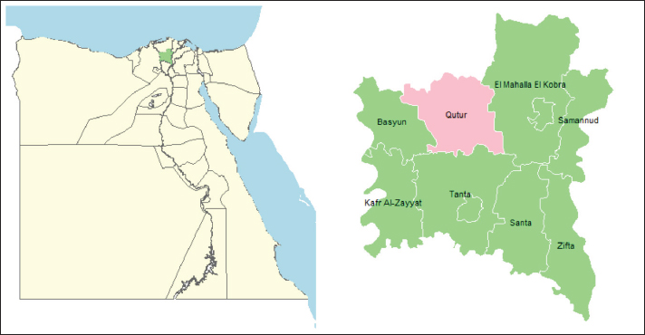 Fig. 1. Map of sampling area in Gharbia governorate, Egypt. Table 1. Breeds and numbers of examined animals reared under commercial and production systems in Gharbia governorate, Egypt, for serological investigation of BoHV-1.