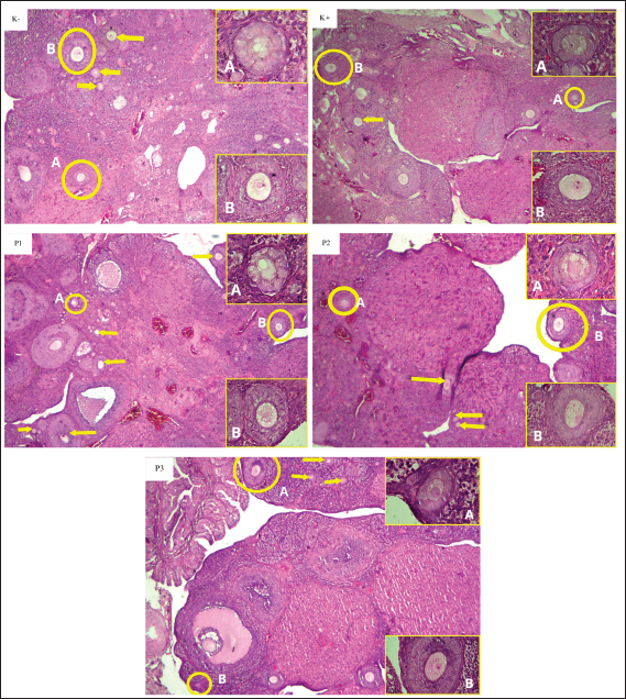 Fig. 2. Histopathological description of preantral ovarian follicles of white rats (R. norvegicus) given curcumin nanoparticles as a prevention of exposure to carbon black in the K−, K+, P1, P2, and P3 groups with 40× magnification HE staining. The circles and arrows of yellow color indicate the preantral follicles [primary and secondary follicles (A and B) observed]. In box shows the primary follicle (A) and the secondary follicle (B). The negative (K–) and positive (K+) control groups were given aquades + Na-CMC 0.5% orally, while the treatment group received different doses of curcumin nanoparticles, namely, in the P1 (50 mg/kgBW), P2 (100 mg/kgBW), and P3 (150 mg/kgBW) groups. DiscussionStatistically, the data in Table 1 shows that the K(−) group and the K(+) group are significantly different from each other. The K(−) group has an average number of preantral follicles 27.17 and antral 18.50, while in the K(+) group, the average number of preantral follicles was obtained 10.33 and antral 9.17. This indicates that exposure to carbon black can inhibit the development of follicles, causing inflammation and apoptosis in follicle cells. A decrease in the number of follicles has been as stated by Luderer et al. (2022), and carbon black can affect folliculogenesis and increase the risk of infertility. The use of curcumin as an antioxidant in this study had a beneficial influence on the development of follicles after exposure to carbon black. A study conducted by Sahebkar et al. (2015) showed that curcumin compounds provided significant reductions in oxidative stress markers, including superoxide dismutase, catalase, glutathione peroxidase, and lipid peroxide. In addition, curcumin reduces the response of proteins involved in inflammatory processes, such as tumor necrosis factor alpha (TNF-α), interleukin-1 (IL-1), IL-2, IL-6, IL-8, and IL-12 (Anthwal et al., 2014).