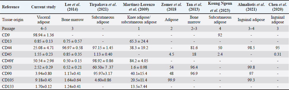 ConclusionIn conclusion, the research offers a comprehensive understanding of the characteristic and differentiation potency of visceral Rab-ADMSC, which has a fibroblast-like shape morphology and plastic adherent. Visceral Rab-ADMSC has the proliferative capability as well as expression of senescence- and stemness-related markers such as NANOG, SOX2, CDKN1A, and TP53. The evaluation of mesenchymal stem cell surface markers reveals that the visceral Rab-ADMSC performs high expression of CD9, moderate expression of CD44 and CD49f, low expression of CD105, CD90, and CD73, and negative expression of CD13 and CD133 as well as CD45 as a hematopoietic stem cell marker. The visceral Rab-ADMSC fulfills the phenotype and genotype characterization multilineage differentiation into adipogenic, chondrogenic, and osteogenic lineage. Thus, this study emphasizes the necessity for the establishment of standard protocols to address the discrepancy of phenotype and genotype characterization of rabbit MSC to support reproducibility in biomedical and translational research. AcknowledgmentThe authors would like to thank the Research Center for Vaccine Technology and Development (RCVTD), Institute of Tropical Diseases, Universitas Airlangga, for providing the facilities for this study. This study was supported by grants from the Directorate of Research, Technology and Community Service, Ministry of Education, Culture, Research and Technology Republic of Indonesia through Regular—Fundamental Research Grant (Penelitan Fundamental – Reguler) 2024 with grant number 1712/B/UN3.LPPM/PT.01.03/2024. Conflict of interestThe authors declare that they have no conflict of interest. FundingThis study was supported by grants from the Directorate of Research, Technology and Community Service, Ministry of Education, Culture, Research and Technology Republic of Indonesia through Regular—Fundamental Research Grant (DRTPM, Penelitan Fundamental – Regular) 2024 with grant number 1712/B/UN3.LPPM/PT.01.03/2024. Authors’ contributionAA: performed the experiment, analyzed data, and wrote the manuscript. SK and WR: designed, conceptualized, and supervised the study, and wrote the manuscript. ISY and LS: performed adipose tissue isolation and conceptualized the study. HS and DD: performed visceral Rab-ADMSC processing, maintained cell culture work, and analyzed the data. All authors have read and approved the final manuscript. Data availabilityAll data are provided in the manuscript. ReferencesAlmaliotis, D., Thomas, A., Komnenou, A., Gounari, E., Almpanidou, S., Siempis, T., Papaioannou, N., Koliakos, G., Papakonstantinou, E., Sotiropulos, K. and Karampatakis, V. 2021. Evaluation of clinical and histological outcomes of adipose-derived mesenchymal stem cells in a rabbit corneal alkali burn model. Stem Cells Int. 2021, 6610023. Calle, A., Zamora-Ceballos, M., Barcena, J., Blanco, E. and Ramirez, M.A. 2022. Comparison of Biological Features of Wild European Rabbit Mesenchymal Stem Cells Derived from Different Tissues. Int. J. Mol. Sci. 23(12), 6420. Cawthorn, W.P., Scheller, E.L. and MacDougald, O.A. 2012. Adipose tissue stem cells meet preadipocyte commitment: going back to the future. J. Lipid. Res. 53(2), 227–246. Chen, G., Zhang, W., Zhang, K., Wang, S., Gao, Y., Gu, J., He, L., Li, W., Zhang, C., Zhang, W., Li, M., Hao, Q. and Zhang, Y. 2020. Hypoxia-induced mesenchymal stem cells exhibit stronger tenogenic differentiation capacities and promote patellar tendon repair in rabbits. Stem Cells Int. 2020, 8822609. Council, N.R. 2010. Guide for the care and use of laboratory animals Eighth Edition (Eighth ed.). Washington, DC: The National Academies Press. Dominici, M., Le Blanc, K., Mueller, I., Slaper-Cortenbach, I., Marini, F., Krause, D., Deans, R., Keating, A., Prockop, D. and Horwitz, E. 2006. Minimal criteria for defining multipotent mesenchymal stromal cells. The International Society for Cellular Therapy position statement. Cytotherapy 8(4), 315–317. Esteves, P.J., Abrantes, J., Baldauf, H.M., BenMohamed, L., Chen, Y., Christensen, N., Gonzalez-Gallego, J., Giacani, L., Hu, J., Kaplan, G., Keppler, O.T., Knight, K.L., Kong, X. P., Lanning, D.K., Le Pendu, J., de Matos, A.L., Liu, J., Liu, S., Lopes, A.M., Mage, R. 2018. The wide utility of rabbits as models of human diseases. Exp. Mol. Med. 50(5), 1–10. Frese, L., Dijkman, P.E. and Hoerstrup, S.P. (2016). Adipose tissue-derived stem cells in regenerative medicine. Transfus. Med. Hemother. 43(4), 268–274. Gao, Y., Chi, Y., Chen, Y., Wang, W., Li, H., Zheng, W., Zhu, P., An, J., Duan, Y., Sun, T., Liu, X., Xue, F., Liu, W., Fu, R., Han, Z., Zhang, Y., Yang, R., Cheng, T., Wei, J. an Zhang, X. 2023. Multi-omics analysis of human mesenchymal stem cells shows cell aging that alters immunomodulatory activity through the downregulation of PD-L1. Nat. Commun. 14(1), 4373. Guneta, V., Tan, N.S., Chan, S.K., Tanavde, V., Lim, T.C., Wong, T.C. and Choong, C. 2016. Comparative study of adipose-derived stem cells and bone marrow-derived stem cells in similar microenvironmental conditions. Exp. Cell Res. 348(2), 155–164. Hsieh, C.C., Hsu, S.C., Yao, M. and Huang, D.M. 2021. CD9 upregulation-decreased CCL21 secretion in mesenchymal stem cells reduces cancer cell migration. Int. J. Mol. Sci. 22(4), 1738. Hu, X., Tang, J., Hu, X., Bao, P., Pan, J., Chen, Z. and Xian, J. 2018. MiR-27b impairs adipocyte differentiation of human adipose tissue-derived mesenchymal stem cells by targeting LPL. Cell Physiol. Biochem. 47(2), 545–555. Jurgens, W.J., Oedayrajsingh-Varma, M.J., Helder, M.N., Zandiehdoulabi, B., Schouten, T.E., Kuik, D.J., Ritt, M.J. and van Milligen, F.J. 2008. Effect of tissue-harvesting site on yield of stem cells derived from adipose tissue: implications for cell-based therapies. Cell Tissue Res. 332(3), 415–426. Kim, J.Y., Park, E.J., Kim, S.M. and Lee, H.J. 2021. Optimization of adipogenic differentiation conditions for canine adipose-derived stem cells. J. 