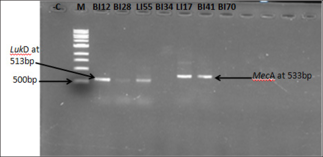 Fig. 2. Gel image showing amplification of mecA and lukD genes among the LA-MRSA isolates. Lane M=1 kb Marker, Lane LI17 and BI41=mecA gene, Lane BI12, BI28, and LI55=lukD gene, Lane BI34 and BI70=mecA and lukD genes negative, and −C=negative control. Table 3. Prevalence of mecA and lukD genes in LA-MRSA isolated from chicken meats.