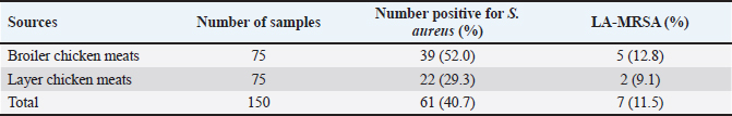 DiscussionIsolation of S. aureus bacteriaLA-MRSA is a prominent drug-resistant bacterium that can spread from animals to humans and is responsible for a wide range of diseases around the world. The current study looked at meat samples from broilers and layers and found that one of the main pathogens causing zoonotic infection is S. aureus, which was shown to be highly prevalent. Exactly, 61 (40.7%) out of the 150 chicken meat samples studied were positive for S. aureus, 39 (52.0%) were from broilers, and 22 (29.3%) were from layer chicken meats. The prevalence of 40.7% reported agreed with the work of Waters et al. (2011) where the isolated 41.0% of S. aureus was found in poultry meat samples. According to Bounar-Kechih et al. (2018), laying chickens carried 42.0%, broiler chickens 12.0%, and bovines 55% of S. aureus. Variable numbers and percentages of S. aureus were also identified in these three species of chickens.
