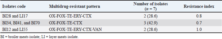 Fig. 1. Multidrug resistance LA-MRSA showing resistant to antibiotics. Oxacillin (OX), cefoxitin (FOX), cefotaxime (CTX), erythromycin (ERY), and vancomycin (VAN). The current observation of this study is also similar to several researchers in different parts of the world who reported different prevalences of S. aureus from poultry meats such as Mamza et al. (2010) who reported 52.5%, Bakheet et al. (2018) who reported 62.8%, and Nworie et al. (2016) who reported 76% prevalence of S. aureus strains. Another study on poultry meat revealed that 42 (72.41%) samples were found positive for S. aureus, which is higher than the report of this research (Sunitha et al., 2017). In the food chain, the contamination of meats, such as chicken by S. aureus, is a serious global issue and the major sources of the contaminants are the food handlers such as the butchers, wholesalers, and retailers of the chicken meat who intend to carry S. aureus in their noses or hands (Tshipamba et al., 2018). The length of time that animals are driven to markets in cages or other vehicles contributes to the spread of S. aureus among the animals, as does the food-producing animals themselves, which can carry the organisms on their skin, nose, and intestine (Ou et al., 2017). Staphylococcus aureus is one of the most significant and widespread foodborne pathogens (Abd El-Ghany, 2021). Staphylococcus aureus produces enterotoxins, which are primarily responsible for food poisoning, and it can cause a wide variety of illnesses, such as septicemia and endocarditis. In 2005, it was determined that animals might also present a health danger to humans due to the discovery of MRSA strains known as LA-MRSA, which have a distinct reservoir in agricultural animals (Thwala et al., 2021). This study identified 7 (11.5%) isolates as LA-MRSA positive out of the 61 (40.7%) samples that were positive for S. aureus. However, 5 (12.8%) and 2 (9.1%) were reported as LA-MRSA positive from broiler and layer chicken meats, respectively. LA-MRSA was found in cattle and poultry at prevalence rates of 6.12% and 6.76%, respectively (Vanderhaeghen et al., 2010). According to another study, there was a 6.76% prevalence of LA-MRSA in chicken flesh from African poultry (Ali et al., 2017). Of the 250 pooled pharyngeal swabs of broiler chickens in The Netherlands, 11 (4.4%) included the LA-MRSA strains (Geenen et al., 2013). LA-MRSA was recovered from nine (7.3%) samples comprising four chicken, three pork, and two turkey products obtained from different butchers and supermarkets (Fox et al., 2016). Friese et al. (2013) revealed the presence of LA-MRSA in broiler samples at a rate of 50%–54% and in turkey samples at 62%–77%. Table 2. Multidrug-resistant pattern of LA-MRSA isolated from chicken meats.