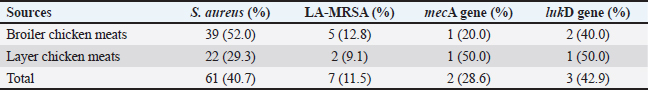 AbstractBackground: Due to its deadly toxins and ability to produce enzymes, the commensal bacterium Staphylococcus aureus is found in animals, birds, and people. It may also be linked to certain medical disorders. Aim: This study was aimed at the prevalence and molecular detection of mecA and lukD genes from livestock-associated methicilin-resistant S. aureus (LA-MRSA) in raw chicken meats sold in Abakaliki. Methods: The butchers in the slaughterhouses provided 150 fresh raw chicken meat samples, which were then cultured and purified using mannitol salt agar. The LA-MRSA was determined using oxacillin and cefoxitin by a disk diffusion method. A polymerase chain reaction was used to investigate the presence of mecA and lukD genes in the isolates that were resistant to cefoxitin and oxacillin. Results: Exactly, 61 (40.7%) out of the 150 samples analyzed were positive for S. aureus, and 39 (52.0%) and 22 (29.3%) were isolated from broiler and layer chicken meats, respectively. Out of the 61 (40.7%) samples colonized by S. aureus, 7 (11.5%) were identified to be LA-MRSA positive using the phenotypic method. Thus, 5 (12.8%) and 2 (9.1%) were recovered as LA-MRSA positive from broiler and layer chicken meats, respectively. All the LA-MRSA was reported to present three major multidrug resistance index patterns. The overall prevalence of mecA and lukD genes was reported as 2 (28.6%) and 3 (42.9%), respectively. Conclusion: This study confirmed the presence of mecA and lukD in LA-MRSA isolated from chicken in Abakaliki, Nigeria, and is a serious public health threat. Keywords: Chicken meats, mecA, LA-MRSA, lukD, public health. IntroductionThe potential for antibiotic-resistant bacteria in animals to spread to humans as foodborne pathogens is a major cause for concern (Effendi et al., 2018). Methicillin-resistant S. aureus (MRSA) is one of the main developing pathogenic strains causing significant issues in veterinary and human medicine, according to a growing number of reports. However, MRSA is drastically increasing among livestock, humans, and their environments (Wu et al., 2019; Tyasningsih et al., 2019). MRSA can spread through direct contact between humans and animals as well as through the use of contaminated surfaces, food, water, and air (Suleyman et al., 2018; Touimi et al., 2020). MRSA has been linked to unsanitary conditions that occur when food is processed, such as when raw chicken meat is contaminated with bacterial toxins. In addition, poor cooking, inappropriate meat storage, incorrect food preparation using contaminated water, and careless handling by food handlers, including butchers and merchants of raw chicken meat, are additional sources of MRSA contamination in food (Abd El-Ghany, 2021). During the process of butchering birds or preparing meat, chicken flesh may become contaminated with MRSA (Abolghait et al., 2020). The high incidence of MRSA in poultry meat, which is regarded as a major health risk for consumers, is strongly correlated with the rise of MRSA in human zoonotic illnesses (Benrabia et al., 2020). Because of the potential for zoonotic transmission from contaminated retail meat to people or through the food chain, MRSA strains have previously attracted a lot of attention (Wu et al., 2019). A particular kind of bacterium known as livestock-associated methicillin-resistant S. aureus (LA-MRSA) has become resistant to several antibiotics. It has been identified in various countries of the world. LA-MRSA has been recognized as a serious pathogen that presents a zoonotic risk to people, particularly those in intimate contact with the disease (Kinross et al., 2017). LA-MRSA has always been associated with animals and animal products and is linked to transmission from animals to humans. LA-MRSA has been reported worldwide from farm animals such as poultry birds and pigs (Fox et al., 2016). Serious worries regarding potential food contamination have been raised by the discovery that LA-MRSA is present in food-producing animals. Research from Africa, Europe, Asia, and North America has demonstrated that MRSA can be retrieved from animals, retail meat, poultry, fowl, and their products (O’Brien et al., 2012; Peter et al., 2022; Tyasningsih et al., 2022). Researchers have discovered that a number of genomic elements encode virulence and resistance genes carried by MRSA. The MRSA mecA gene, which contains insertion sites for genetic elements that promote the enhanced acquisition of resistance determinants to other antimicrobials, encodes PBP2a, which has decreased susceptibility to β-lactam antibiotics (Ito et al., 2012). Staphylococcus aureus strains that carry the mecA gene become resistant to methicillin, which is penicillinase. Staphylococcal cassette chromosome mec (SCCmec) contains this gene, which confers resistance to many antibiotics such as penicillin and beta-lactam. The mecA gene-related multidrug-resistant (MDR) S. aureus strains were found in ready-to-eat meat products, chicken giblets, and retail meat products (Darwish et al., 2018; Morshdy et al., 2018). MRSA from poultry chicken meat has been found to contain multiple toxin gene groups, including enterotoxins (sea, seb, sec, sed, see, seg, seh, and sei), exfoliative toxins (eta and atb), leukocidins (lukE, lukD, and lukM), Panton-Valentine leukocidin (lukS and lukF), and hemolysins (hla, hlb, and hld) (Abdalrahman et al., 2015). MRSA (nuc and mecA positive) has also been recovered from chicken, pork, and turkey (Fox et al., 2016). There are limited studies about LA-MRSA strains that are capable of causing zoonotic infections, and other S. aureus infections in Nigeria, especially at Abakaliki in Ebonyi State. Thus, there is a need for this study, which aimed at the prevalence and molecular detection of mecA and lukD genes from LA-MRSA isolated in raw chicken meats sold in Abakaliki. Materials and MethodsStudy design and samplingA cross-sectional study was conducted; layer and broiler chicken fresh raw mea