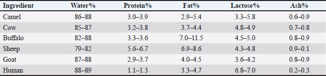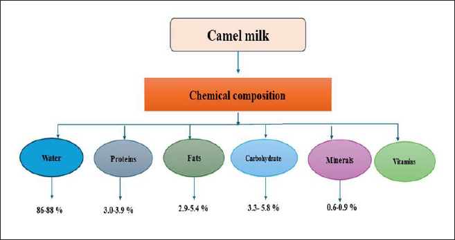AbstractCamel’s milk is a widely consumed staple meal, especially in areas with dry and somewhat dry climates. Camel milk is rich in valuable ingredients, including lactoferrin and zinc, lactoactive peptides, and mono- and polyunsaturated fatty acids, which support optimal health. These compounds have the potential to effectively treat various prominent human illnesses, such as tuberculosis, asthma, gastrointestinal disorders, and jaundice. The composition of camel’s milk is more varied than that of cow’s milk. The composition of camel milk is primarily influenced by nutrition, breed, age, and lactation stage. The composition of camel’s milk exhibits significant variation based on the geographical region and season. These whey proteins possess distinct physical, chemical, physiological, functional, and technological attributes that provide benefits in culinary uses and have high nutritional worth. Hydrolysis breaks down the proteins in camel’s milk into bioactive peptides, which have physiological effects on the body’s major organ systems. Camel milk, rich in essential fats, proteins, lactose, and minerals, positively impacts the treatment of diabetes, hepatitis C, and allergies and improves antioxidant enzyme levels in autistic children and tuberculosis patients. The review explores camel milk’s therapeutic properties, nutritional composition, and implications for treating specific diseases and improving human healthcare. Keywords: Camel milk, Nutritional composition, Therapeutic properties, Mental health. IntroductionMany people, particularly those in the Middle East and Arabian Peninsula desert regions, rely extensively on camels for their livelihood (Kaskous, 2016; Amsidder et al., 2021). Camels possess the ability to adapt to different environments. Camels serve multiple purposes, including transportation, recreation, and providing meat and milk. This contributes to the economy and ensures that people have food access (Suliman et al., 2019; Swelum et al., 2020; Hakim et al., 2024). Based on the most recent data from the FAO, the global population of camels exceeds 29 million, with approximately 95% being dromedary (one-humped) camels (Sikkema et al., 2019). Multiple factors, including breed, animal well-being, lactation phase, and housing conditions, impact the quantity of milk generated (Swelum et al., 2020). Despite the similarity in structure between camel udders and cow udders, camel milk production is lower and more inconsistent than cow milk. Enhancements in nutrition, water supply, and veterinary procedures can increase camel milk production (Felfoul et al. 2015; Swelum et al., 2021; Seifu, 2022). Millions of individuals worldwide consume milk daily because of its numerous nutritional advantages; in particular, milk has a crucial role in enhancing the growth of children’s bones owing to its abundant concentration of calcium and vitamin D. Camel milk has proven benefits for older persons, particularly menopausal women, who are more susceptible to osteoporosis caused by insufficient calcium levels (Swelum et al., 2021). Milk production provides sustenance, income, and food stability to 150 million households globally, benefiting small-scale producers with prompt funding influx (FAO, 2012). Camel milk’s nutritional composition varies based on environmental conditions and fodder type. It contains high immunoglobulin, insulin, vitamins, and minerals, reducing protein, sugar, and cholesterol. Vitamins protect tissues (Hassani et al., 2022). In addition, it is superior in storage at room temperature and is crucial for newborn calves’ growth and development, with its whey component containing more antimicrobial substances than bovine milk (Ho et al., 2022). Furthermore, it has a higher protein level than bovine milk due to its 21 essential amino acids. Casein makes up 52.07% of total proteins, while bovine milk has only 18 amino acids. Camel milk offers anti-hypersensitive, anti-diabetic, and anti-carcinogenic properties (Konuspayeva and Faye, 2021). Camel milk is gaining recognition for its therapeutic benefits, including combating infections, cancer, and diabetes and providing energy for recovery. Human infectious disorders and gastrointestinal malignancies use it as an additional treatment (Swelum et al., 2021). This review investigates the therapeutic advantages of camel milk, emphasizing its diverse role in nutrition and medicine, and calls for further research and recognition of its importance in global health. Chemical composition of camel milkThe camel milk color is usually white, and the taste is slightly salty, although there have been reports of salty camel milk (Abbas et al., 2013). The milk appears opaque, and the flavor is unique. The type of fodder and the availability of drinking water affect the taste of camel milk. Due to its lower density and increased buffering ability, it can withstand a pH of 4.95 (Gul et al., 2015). Several factors, including the physiological stage of the camel, nutritional circumstances, seasonal or physiological changes, and genetics, influence the composition of the milk produced by camels (Elkot et al., 2021). Omer and Eltinay (2008) state that camel milk comprises 97% water, 3.4% protein, 3.5% fat, 4.4% lactose, and 0.79% ash. Table 1 displays the milk components across various animal species. Figure 1 presents a schematic graphic that illustrates camel milk’s chemical structure. WaterCamel milk is primarily composed of water. Dehydrated camel milk has a greater amount of water compared to other forms of milk. When water is abundant, it has a water content of 86%, but it increases to 91% when it is scarce. Sisay and Awoke (2015) indicated that they can employ this method to replenish the body fluids of individuals and remove fluids from livestock in situations where access to clean water is not possible. The milk of a dehydrated camel contains a higher proportion of water due to an increase in antidiuretic hormone sy