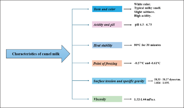 Fig. 1. Schematic diagram illustrating the composition of camel milk. Camel milk is a significant source of Cl, mostly because camels consume plants such as Atriplex and Acacia (Wang et al., 2011). Camel milk has larger concentrations of Na, K, Fe, Cu, Zn, and manganese (Mn) compared to cow udder, although the levels of Mg, P, and Ca are comparable in both types (Singh et al., 2017; Swelum et al., 2021). Ho et al. (2022) found trace element concentrations in camel and human milk, with Fe, Zn, and Cu concentrations of 1.37, 2.19, and 0.44 mg/100 g, respectively. When contrasted with camel and cow milk, human milk includes the smallest levels of Ca, P, Fe, Zn, Na, K, and Mg. However, it has the highest Mn content (El-Aziz et al., 2022). VitaminsAnimal milk contains vitamins and fats that are soluble in water. Camel milk stands out due to its exceptional abundance of vitamin C. Its vitamin C concentration is much higher, between 3.0 and 7.5 mg per 100 g, compared to cow’s milk, which contains only 0.8–2 mg per 100 g. However, its vitamin C level is like that of human milk, which ranges from 1.19 to 7.84 mg per 100 g, with an average of 4.86 mg per 100 g (Bouhaddaoui et al., 2019). Similarly, camel milk demonstrated elevated concentrations of vitamin B1, B12, folic acid, and pantothenic acid compared to cow’s milk (Ansari et al., 2024). Furthermore, Qin et al. (2022) noted that the vitamin D level in Bactrian camel milk (640–692 IU/l) is greater than that in cow’s milk (20–30 IU/l). Wang et al. (2011) found that camel milk has lower concentrations of vitamins B1 and B2, folic acid, and pantothenic acid but higher levels of vitamins B6 and B12. In addition, Faye et al. (2019) found that the levels of vitamins E, B6, and B1 in camel milk were comparable to those in cow’s milk. Muthukumaran et al. (2023) found that camel milk contains fewer Vit A and E compared to cow’s milk but more Vit C and B3 than cow’s milk, with lower levels of B1, B2, B5, B12, and α-tocopherol. Characteristics of Camel MilkTaste and colorCamel milk is characterized by its opaque white color, typical milky smell, slight saltiness, and high acidity. The camel’s diet and lactation stage primarily influence these properties (El-Aziz et al., 2022; Kishore et al., 2024). The reduction in key components of milk and the enhancement in Cl level in milk collected from dehydrated camels and their feed could contribute to the salty taste of camel milk (Konuspayeva et al., 2022; Laameche et al., 2024). The taste of camel milk may vary depending on the camel’s habitat. The milk derived from camels indigenous to the American continent is characterized by its saccharine, mildly saline, and velvety consistency. The flavor of camel milk in the Middle East is reminiscent of hazelnuts (Galali and Al-Dmoor, 2019). Whey camel milk, after coagulation, reveals a white color, while whey caw milk has a greenish hue due to light dispersion caused by tiny fat globules and caseins (Sakandar et al., 2018; Arain et al., 2023). Figure 2 shows a schematic of camel milk’s characteristics. Acidity and pHCamel milk has a pH ranging from 6.5 to 6.75, such as cow milk’s pH range (6.4–6.8), but lower than human milk’s one (6.75–7.42). The average pH of human milk is 7.09 (Alhaj et al., 2022). Camel milk exhibits an acidity level between 0.14% and 0.15%, like cow milk’s acidity, specifically 0.15% (Karmaker et al., 2020; El-Aziz et al., 2022). According to Yogananda et al. (2014), the acidity concentration in fresh camel milk is approximately 0.13%–0.16%, marginally less than the average acidity content of 0.17% in cow milk. The acidity percentage in camel milk appears to vary depending on the breed. Abdullahi (2019) stated that the pH of camel milk falls within the lower range of 6.2–6.5 in comparison to cow’s milk. Heat stabilityAt high temperatures, camel milk exhibits lower thermal stability than cow milk. The inability to sterilize camel milk at a natural pH is due to the significant magnitude of the casein micelles and the absence of β-lactoglobulin (LG) and α-casein (CN) (Seifu, 2023). Also, Sakandar et al. (2018) state that CN and Ca significantly impact camel milk’s thermal stability. At a temperature of 130°C, cow milk exhibits its highest heat stability level when the pH is 6.7 and its lowest level when the pH is 6.9. In contrast, camel milk does not demonstrate improved stability at a pH of 6.7 (Ho et al., 2022). The primary issue with stored UHT camel milk is protein settling, which necessitates the use of certain chemicals to ensure its structural integrity. It optimized the thermal resistance of sterilizing camel milk at pH levels from 7.0 to 7.2, whereas the least heat stability was observed at pH levels from 6.5 to 6.8. High-temperature short-time methods can effectively pasteurize camel milk without any observable protein precipitation (Alhaj et al., 2022). Camel milk exhibited greater heat stability of whey proteins than cow milk (Mohamed et al., 2022; Saadi et al., 2024). When exposed to a temperature of 80 °C for 30 minutes, the denaturation of whey proteins in camel milk was found to be lower, at around 32%–35%, compared to cow milk whey proteins, which experienced denaturation of approximately 70%–75% (Lajnaf et al., 2023).