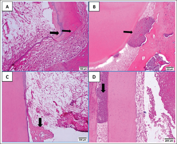 Fig. 4. A: Representative photomicrographs of blood clot + HA group showing apical closure with cementum like tissue, evidence of cementocytes inside the apical openings (arrows) and dense basophilic condensations (blue arrow, B). C: Representative photomicrograph of blood clot + collagen group showing cemntum like tissue inside the root canal (arrow). D: Photomicrograph of blood clot + collagen group dense basophilic condensations (arrow). (H&E. A: 200, B, C and D: ×100). As indicated in Table 1, the treatment groups (A, B, and C) exhibited significantly higher values (p < 0.05) for tissue ingrowth than the control group (D). There were no noteworthy distinctions (p > 0.05) observed among the A, B, and C treatment groups. Group D displayed the lowest tissue ingrowth value (0.0 ± 0.0). DiscussionDue to the lack of an apical stop and the fragile dentin walls, teeth with immature apices pose challenges for standard root canal therapy (Tawfik et al., 2013). Various approaches have been proposed to address these issues, such as calcium hydroxide apexification (Andreasen et al., 2002) and MTA (Holden et al., 2008; Nabeel et al., 2024). As a biologically based substitute that enables more root maturation in length and thickness through the regeneration of essential tissue, RE has attracted a lot of interest lately (Hargreaves and Law, 2011; Talaat et al., 2024). The current study compared the histological efficacy of collagen and HA hydrogel as scaffolds for pulp regeneration in immature, necrotic dog teeth following revascularization. The current study is based on experimental animals. Animal studies have a crucial role in healthcare investigations particularly when meta-analyses of animal studies are conducted (Hooijmans et al., 2014). Additionally, animal models are commonly used to test the efficacy of drugs or techniques before proceeding to clinical trials (Roberts et al., 2002). However, animal studies possess some limitations, including the diversity of the experimental design and study characteristics (Hooijmans et al., 2014) and the poor methodological quality which increases the risk of bias (Kilkenny et al., 2009). One of the most important limitations of animal studies is that there are critically important physiological and genetic differences between humans and animals, which can invalidate the use of animals to study human diseases, and treatments. Animal experimentation generally, are inadequate bases for predicting clinical outcomes in human beings in the great bulk of biomedical science (Akhtar, 2015).