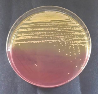 Fig. 1. Colonies of S. aureus in MSA. It is not realized that transmission of S. aureus from cats can occur due to frequent direct contact between humans and cats, this is because cases of S. aureus infection in humans are more widely known in the community (Khairullah et al., 2023). Because cats are frequently maintained as pets and are therefore a reservoir for the spread of S. aureus, there is a chance of zoonotic transmission (Khairullah et al., 2020). Cats are susceptible to infection because S. aureus is present on their skin and fur (Bierowiec et al., 2016). Recent research has indicated that cats may have a role in the transmission of S. aureus within the home (Afnani et al., 2022; Millannia et al., 2023; Waruwu et al., 2023).