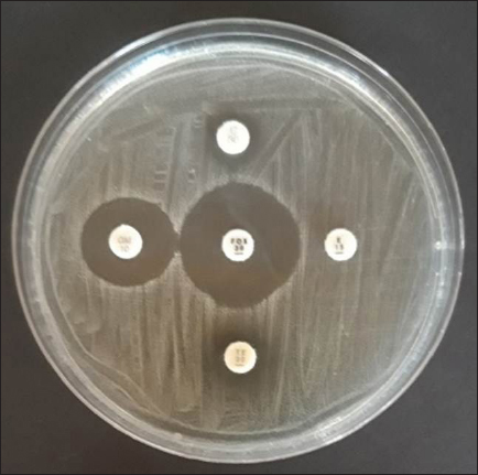 Fig. 3. Analyze the antibiotic sensitivity of a S. aureus isolate grown on MHA. The S. aureus isolate sensitivity results showed some resistance to the antibiotics erythromycin, tetracycline, cefoxitin, gentamicin, and chloramphenicol, each tested with variable degrees of resistance. The findings revealed that 29.69% (19/64) of the S. aureus isolates from cat nose swab samples at the Surabaya City Animal Hospital were resistant to antibiotics. These isolates included 11 from the Airlangga University Animal Hospital and 8 from the East Java Animal Husbandry Service Animal Hospital. These findings support the claims made by Qekwana et al. (2017) who isolated 63% (24/38) of S. aureus from cats at the Teaching Animal Hospital in South Africa has antibiotic resistance. Table 3. Profile of antibiotic resistance in isolated S. aureus.