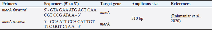 AbstractBackground: The most susceptible group of people to spread methicillin-resistant Staphylococcus aureus (MRSA) among domestic cats is their owners’ relatives. Aim: Considering the aforementioned, research at the Surabaya City Animal Hospital is necessary to determine whether the mecA gene may be detected in cat nasal swabs. Methods: Samples were taken using a sterile cotton swab, and the transport medium was buffered peptone water. Standard operating procedures in microbiology were then employed to identify the samples. Using five distinct antibiotic discs, the Kirby-Bauer diffusion method was used to determine the antibiotic resistance profile of S. aureus. All cefoxitin-resistant S. aureus isolates were tested for MRSA and then the mecA gene was detected. Results: Based on morphological culture features, Gram staining, and biochemical assays, 64 samples (64%) of the 100 isolated cat nose swab samples were positive for S. aureus, according to the results of the biochemical tests. The profile of antibiotic resistance developed from the results of the S. aureus resistance test to antibiotics revealed that five (7.81%) of the 64 S. aureus isolates were confirmed to be multidrug resistant. Out of the 6 MRSA isolates analyzed, the mecA gene was detected in 5 isolates. Conclusion: Based on the findings of this study, a thorough assessment of the impact of using antibiotics to prevent the spread of MRSA in veterinary hospitals on the general public’s health is required in light of the detection of MRSA isolates bearing the mecA gene in the Surabaya veterinary hospital. Keywords: Antibiotic, Cat, MDR, MRSA, Public health. IntroductionOne of the animals that is frequently kept as a pet is the cat. The fact that cats can benefit their owners by lowering the effects of stress, creating a pleasant environment, and regaining mental stability is a common reason why people desire to keep cats (Afnani et al., 2022). Cats are a popular pet due to their non-noisy nature, ease of maintenance, and exceptional ability to adapt to their surroundings. To keep cats healthy and less prone to illness, it is important to take good care of them (Hesselmar et al., 2018; Kaben et al., 2024). A bacterial infection in cats is one potential illness. In cats and other animals, Staphylococcus aureus is a typical microorganism of the natural bacterial flora that can be detected on the skin and nasal mucosa (Bierowiec et al., 2019). Despite the fact that the bacteria are present in clinically healthy people, they can nevertheless cause a number of infections when the immune system is compromised (Khairullah et al., 2019; Khairullah et al., 2022a). Staphylococcus aureus is a Gram-positive bacterium, non-motile, spherical, 0.8–1 µm in diameter, grouped in clusters resembling grapes, and does not produce spores (Ramandinianto et al., 2020; Khairullah et al., 2020a). This bacterium is commonly found in infections in cats. Companion animals, especially cats, can act as a reservoir for the propagation of bacterial illnesses brought on by S. aureus, endangering public health (Gwenzi et al., 2021; Llor and Bjerrum, 2014). It is currently known that S. aureus bacteria originating from animals can infect humans or other animals, given that cats are frequently treated as family members to enable physical interaction between people and animals, including skin-to-skin contact, aerosols from coughing, sneezing, and saliva (Elmoslemany et al., 2021; Rahmaniar et al., 2020). Methicillin-resistant Staphylococcus aureus (MRSA) is associated with resistance of S. aureus isolates to β-lactam antibiotics and with recurrent nosocomial infections (Green et al., 2014; Nimer, 2022). It is believed that all β-lactam antibiotics, including carbapenems and cephalosporins, are useless against cefoxitin-resistant MRSA bacteria (Gajdács, 2019). Compared to human MRSA isolates, animal MRSA isolates were shown to have significantly greater levels of ampicillin, ciprofloxacin, cotrimoxazole, erythromycin, clindamycin, azithromycin, and tetracycline resistance (Fitranda et al., 2023). In MRSA strains, the mecA gene is located on a cellular genetic component known as the staphylococcal cassette chromosome mec (SCCmec) (Rajabiani et al., 2014; Saber et al., 2017). This gene produces Penicillin-binding protein 2a (PBP2a), which has a lesser affinity than regular PBP for β-lactam antibiotics (Fergestad et al., 2020). Strains of S. aureus with the mecA gene will have resistance to β-lactam antibiotics (Ramandinianto et al., 2020). The city of Surabaya is one of the big cities in Indonesia which has animal hospitals including the Airlangga University Educational Animal Hospital and Animal Husbandry Service Animal Hospital of East Java Province. Veterinary Hospital in Surabaya still conducts very little research on the detection mecA gene in cats (Decline et al., 2020). Since MRSA is one of the primary sources of infection in cats, this will negatively impact the selection of treatments to be used in the management of the illness (Costa et al., 2022). The purpose of this study was to detect the mecA gene from cat nasal swabs at the Animal Hospital in Surabaya. The results of this study are important as a reference to understand how resistance develops and how to apply detection methods in animal hospitals. Materials and MethodsStudy area and sample collectionThe study has been carried out in March–April 2024. Cat nose swab sampling was done in Surabaya at the Airlangga University Teaching Animal Hospital and the East Java Provincial Animal Husbandry Hospital, while bacterial isolation and sensitivity tests were done at the Microbiology Laboratory, Airlangga University. The cat’s nasal mucosa was sampled with a sterile cotton swab (OneMed) and Amies transport medium (Charuzu). The cotton swab is placed inside the Amies transport medium tube, which is then labeled and preserved in a coolbox. Isolation and identification of S. aureusIsolates th