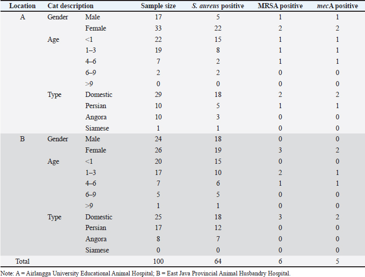 Table 2. Isolation of S. aureus, MRSA, and mecA gene from cat nose swabs.