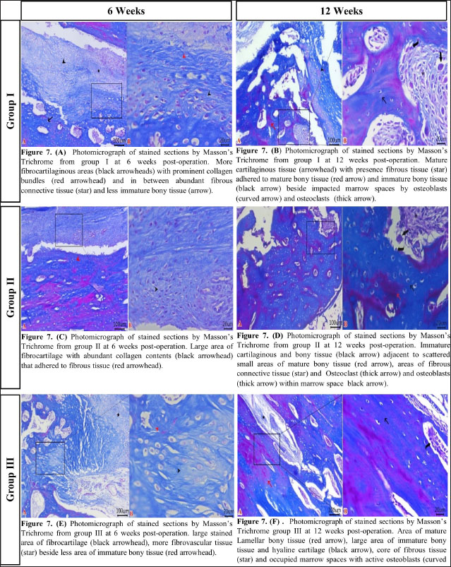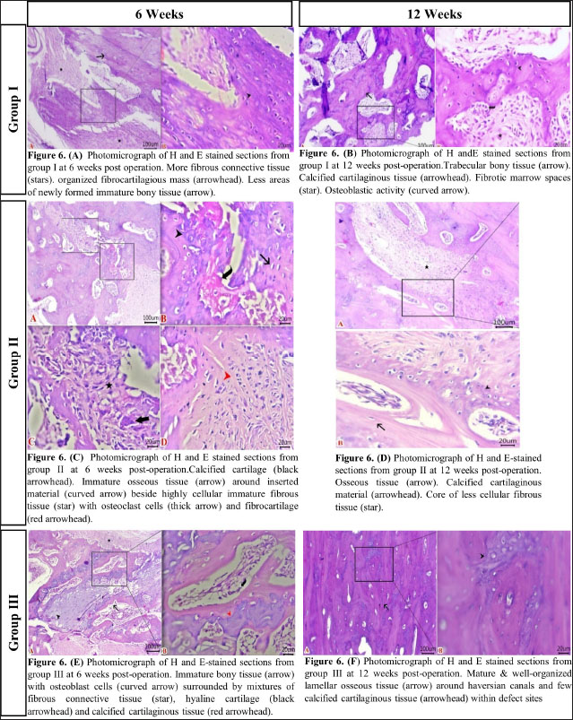 Fig. 2. The mediolateral radiographs of groups I–III were obtained immediately following the surgical procedure (PO) and at 6- and 12-week post-surgical intervention. The white arrow clearly shows the defect’s location and the progress of healing. According to the findings of radiographic statistical analysis (Fig. 3A), there were no significant differences between the groups at 6 weeks in terms of defect healing, as evaluated using the Lane–Sandhu radiographic score (p > 0.05). However, at 12 weeks, there were highly significant differences observed between groups I and II (p=0.006), as well as between groups I and III (p=0.002). However, there were no notable statistical differences observed between groups II and III. Gross findingsIn gross examinations at 6 weeks (Fig. 4), the gap in group I remained unclosed and was filled with fibrous tissue, while the gap was also visible in group II, but it was smaller in diameter. Group III exhibited bone segment stability and partial repair. The defect in group I at 12 weeks was clearly visible, with fibrous-like tissue filling the space between the defects. However, in groups II and III, complete bone healing was observed 12 weeks post-surgical operation (Fig. 4). In the gross examination statistical analysis, there were no statistically significant differences in these scores between the groups at six weeks (Figure 3.B). At 12 weeks, the quantification data of the gross examination revealed that the regenerated area of the radius defect was statistically significant in groups III and II in comparison to group I, p=0.041 (Fig. 3B). CT findingsThe 3D CT images of the 6-week postoperative groups, as illustrated in (Fig. 5), showed that in group I, the bone defect was clear with a well-defined appearance. Group II had a persistent and distinct fracture line, indicating a lack of bone trabeculae connection, but the defect was smaller in size than group I, so distinct new bone formation. In group III, the CT 3D revealed bone trabeculae continuity, but new bone growth was confined to the uni-cortical bone next to the ulnar bone. The edges of the bone defects in group I were clearly defined, and a reduction in the diameter of the defects was observed 12 weeks postoperatively, as illustrated in Fig. 5. The bone defect in groups II and III at 12 weeks was completely filled with bone and vanished (Fig. 5). The bone trabeculae continuity was well defined. The quantitative results of CT, which were obtained using Cheung’s scoring method, indicated that there were no statistically significant differences between the groups at 6 weeks following surgery (p > 0.05). Group III had the highest score at 12 weeks post-surgery, and statistically significant differences were evident between groups I and III ( p=0.0065) and groups I and II (p=0.029). However, there were no statistically significant differences between groups II and III (Figure 3C). Histopathological findingsIn group I at 6 weeks stained with H and E (Fig. 6A), the defect site was filled with more fibrous connective tissue and an organized fibrocartilaginous mass. The same group stained with Masson’s trichrome showed more fibrocartilaginous areas with prominent collagen bundles between abundant fibrous connective tissue (Fig. 7A). Group II at 6 weeks, stained with H and E (Fig. 6C), revealed calcified cartilage, immature osseous tissue around “inserted material,” and highly cellular immature fibrous tissue with osteoclast cells filling the gap. Fibrocartilage surrounds chondroblastic and osteoblastic metaplasia. Staining with Masson’s trichrome exhibited a large area of fibrocartilage with abundant collagen contents that adhered to fibrous tissue. Chondroblastic and osteoblastic metaplasia were also noticed (Fig. 7C). The H and E staining section in group III at 6 weeks revealed immature bone tissue with osteoblast cells surrounded by fibrous connective tissue, hyaline cartilage, and calcified cartilaginous tissue (Fig. 6E). Masson’s trichrome stained a large area of fibrocartilage, more fibrovascular tissue, and less immature bone tissue (Fig. 7E). Group I at 12 weeks, sectioning stained with H and E, was filled with trabecular bone tissue, calcified cartilage, and fibrotic marrow spaces. The osteoblastic activity was also seen between mature chondrocytes and newly formed bone (Fig. 6B). Masson’s trichrome presented mature cartilaginous and fibrous tissue adhering to mature and immature bone tissue. Impacted osteoblastic and osteoclastic activity in marrow spaces was seen (Fig. 7B). The histopathological examination of group II, which employed the H and E stain, proved the presence of calcified cartilaginous material, osseous tissue, and a core of less cellular fibrous tissue. Bone marrow spaces that contained osteoblast cells were also observed (Fig. 6D). In Group II, Masson’s trichrome, immature cartilaginous and bony tissue was seen alongside small areas of mature bone and fibrous connective tissue. Marrow contained osteoclasts, osteoblasts, and active fibrous tissue (Fig. 7D). Group III at 12 weeks had mature, well-organized lamellar osseous tissue around the Haversian canals and a few calcified cartilaginous tissues at the defect site (Fig. 6F). The same group Masson’s trichrome identified mature lamellar bony tissue as “pink color,” an extensive area of immature bone and hyaline cartilage, and a fibrous tissue core. Also, active osteoblasts filled marrow spaces (Fig. 7F).