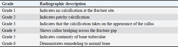 Ethical approvalThe experimental protocol was approved by the Zagazig University Committee of Animal Welfare and Research Ethics. ResultsRadiographic findingsThe mediolateral radiograph was obtained immediately following the surgical procedure. The radiographs in group I were radiolucent, while those in group II were marginally radiopaque. Group III radiographs serve as illustrations of radiopaque density (Fig. 2). Following 6 weeks post-implantation, the radiographs of the segmental bone defect in group I showed a lack of bone union and considerably reduced radiopacity when compared to the neighboring healthy bone, indicating that bone regeneration is limited. Compared to group I, groups II and III showed a significant reduction in the extent of defects due to enhanced bone regeneration but without identifying the bone union (Fig. 2). Table 3. Histological examination Emery’s scoring system.