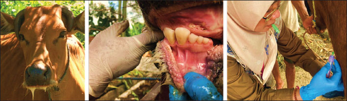 Fig. 2. Sampling of oral mucosa, saliva, and blood plasma specimens from cows showing clinical symptoms of FMD affected cattle (Animal Diseases Investigation Maros documentation). Real-time PCR FMDV 3DThe t-RNA amplification process for extracted specimens used the AgPath-ID One-step RT-PCR Kit (Ambion-ABI P/N AM1005) (manual-based procedure) and 1 µl of each primer. The primers/probe used in RT-PCR PMK testing 3D are Primer 3D 6769 F (5′-ACT GGG TTT TAC AAA CCT GTG A-3′); Primer 3D 6875 R (5′-GCG AGT CCT GCC ACG GA-3′); and 3D Primer 6820 P (5′-TCCTTTGCACGCCGTGGGAC′-BHQ1-3′). The FMDV 3D rRT-PCR was a modified version of the assay described by Callahan et al. (2002). The thermal cycling parameters for DNA amplification on the settings in the Applied Biosystems® 7,500 real-time PCR machine with thermal cycling conditions are as follows: (1 ×) 50°C for 2 minutes, 95°C for 10 minutes, (50 ×) 95°C for 15 seconds, and 60°C for 60 seconds. A positive control FMDV sample was included in each run as well as a negative water sample. The cutoff of the assay was set at a Ct-value of 45. Data analysisThe data obtained were analyzed descriptively with Microsoft Excel and using the analysis of variance (ANOVA) statistical program on SPSS version 17.0 statistical software package (SPSS Inc., Chicago, IL) using one-way between subjects. Differences were considered statistically significant at p-value of less than 0.05 (p value <0.05). Ethical approvalThis study was approved by Hasanuddin University Research Ethics Committee, University Faculty of Medicine (Approval No. 346/UN4.6-4.5.3L/ PP36 / 2023). ResultsClinically positive 109 samples with different kinds of specimens (oral mucosal epithelial swabs, saliva, and blood plasma) were evaluated by RT-PCR for the diagnosis of FMD using specific primers 3D. Samples producing a curve above the threshold value (ct) were considered positive. A graphic quantification of amplification showing the result, and melting curve on the PCR product is shown in Figure 3. The significant advantages of qPCR include its ability to measure DNA concentrations over a large range, sensitivity, ability to process multiple samples simultaneously, and ability to provide immediate information (Ekawasti et al., 2024). Unlike conventional PCR, real-time PCR uses fluorescence so that every time amplification occurs, a fluorescence signal will be formed, which will be captured by the detector throughout the PCR process. The amplification process is repeated in several cycles, and the resulting fluorescence signal will be directly proportional to the amplification that occurs. At one point, the number of fluorescence signals in the amplification process reaches a minimum value to be interpreted as a positive result. This point is called the cycle threshold (CT) value (Callahan et al., 2002). The amplification program settings, namely using passive reference, are selected NONE, reporter dye fluorescein amidine (FAM), and quencher NONE. The interpretation of the amplification results is seen from the CT value, namely if <40, then it is declared positive; between 40 and 45 is considered intermediate, and ≥45 is negative, and the PCR machine lists undetermined.