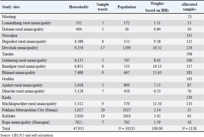 AbstractBackground: Climate change has a significant impact on livestock farming around the globe. Farmers have adopted different strategies to mitigate the adverse impact of climate change. Females in developing countries are more vulnerable to climate change impacts and have lower adaptive capacity and they bear additional roles and responsibilities in livestock rearing compared to their male counterparts. Aim: The main aim of this study is to examine the gender perspective on climate change adoption strategies in livestock farming in Gandaki province, Nepal. Methods: A multistage random sampling technique was employed to select 1,158 households from five districts in Gandaki province, western Nepal. A household head or household member who was 45 years or older resided in that area for at least 15 years and owned at least one primary livestock at the time of the survey was selected as the ultimate respondent from each selected household. Both structured and unstructured questionnaires were prepared. A structured questionnaire was used for the household survey, while a checklist (guideline) was prepared for focus group discussions. Data were collected through face-to-face interviews, and both descriptive and inferential statistics were used for data analysis. Results: The results revealed that buffalo was the primary livestock among farmers. More than half of farmers, both men and women were aware of the impact of climate change on livestock. While this study did not find significant gender-based differences in adaptation strategies, the odds of adoption are higher among males than females. Jobs other than agriculture and livestock, as well as access to credit, emerged as key determining factors associated with adaptation strategies among farmers in Gandaki province. Conclusion: There is no significant gender-based difference in adaptation strategies; however, employment outside agriculture and livestock, along with access to credit, are the key determining factors associated with adaptation strategies. Keywords: Adaptation, gender, climate change, livestock. IntroductionThe latest Intergovernmental Panel on Climate Change (IPCC-AR6, 2023) synthesis report reveals that the average global surface temperature increased by 1.08°C (0.95–1.20) during the period 2011–2020. Other visible evidences reported by IPCC, such as extreme weather events, sea level rise, ocean acidification, and changes in biodiversity, also confirm that climate change has occurred globally. The temperature in Nepal has been found to increase at an annual rate of 0.054°C. The maximum and minimum temperatures are increased at the rate of 0.05°C and 0.03°C annually, respectively. A national-level study reveals similar temperature trends between 1971 and 2014 (DHM, 2017). Livestock is an integral part of agriculture globally and it contributes to global calorie and protein supplies such as meat, milk, and eggs (FAO, 2009; Thornton, 2010; Thornton and Gerber, 2010). Nepal is an agriculture-dominated country, with livestock being an essential part of the mixed agriculture system. The agriculture and forestry sectors contribute 25.8% to the gross domestic product (GDP) and provide employment opportunities to 73.9% of the total employed population. Similarly, livestock alone contributes 27% of agriculture’s GDP and about 13% of the national GDP (CBS, 2019; MOF, 2021). Nepal, recognized as “one of the most disaster-prone countries” in terms of climate-related hazards, sees a particularly strong impact on its farmers. Nepalese smallholder farmers are vulnerable to climate change because of high dependence on rain-fed agriculture, limited access to resources, subsistence farming, lack of information (Gentle and Maraseni, 2012; Budhathoki and Zander, 2020), and fragile mountain ecosystem (Wong, 2020). Climate change affects the livestock sector through different channels, including competition for natural resources, quality and quantity of feeds, the emergence of new kinds of diseases, and heat and cold stresses (Rojas-Downing et al., 2017). Thus, farmers need to cope with the effect of climate change through adoption-led mitigating practices (Aryal et al., 2020). Adaptation in the human system is “the process of adjustment to the actual or expected climate and its effects to moderate harm or exploit beneficial opportunity” (IPCC, 2023). In other words, adaptations are the adjustments made by people in their context to mitigate the negative impact of climate change. Therefore, adaptation is the response to environmental stimuli that affect the systems. Adaptation is supposed to effectively combat climate change, particularly for smallholder and subsistence farmers. Adopting any practice depends on the system’s adaptive capacity, regions, and communities and is primarily influenced by socioeconomic status (Smit et al., 2001). The different means of adaptation at the household level may include the use of adaptive species of livestock, nutritional management strategies, risk management practices, and institutional approaches, i.e., increased accessibility to veterinary services, provision of subsidies, reduction of taxes, and insurance of livestock (Deressa et al., 2008; Rojas-Downing et al., 2017). Globally, about 43.0% of females are engaged in the agricultural sector indicating the significant role of women in agricultural production, livestock, fishery, and forestry (Akter et al., 2017). Females’ participation in the agricultural sector has been increasing in recent decades in developed countries too (Statistics Canada, 2017; Ball, 2020). Climate change harms the overall well-being of men and women; however, the impact is perceived to be different among women (Singh et al., 2010; Jianjun et al., 2015). Furthermore, females in developing countries are more vulnerable to climate change impacts and have lower adaptive capacity (Denton, 2002; Goh, 2012). The study of adaptation status to mitigate the effect o