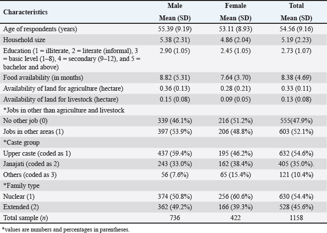 where a1, …, an are the regression coefficients; i is the dependent variable (adaptation strategies); xi is the set of independent variables (i=1, …, n); and ε is the error term. Based on an extensive literature review, a set of independent variables was chosen for the regression analysis (Hassan and Nhemachena, 2008; Sahid et al., 2021). The leading independent variables selected for the regression analysis are age, sex, household size, educational level, food availability (in months), availability of land for livestock, jobs other than in agriculture and livestock, family type, caste group, and involvement in credit schemes for livestock. ResultsBackground characteristics of farmersTable 3 shows the description of selected background characteristics of farmers. The mean age of farmers was 54.56 years, with an average household size of 5.19, which is greater than the national average (4.32) (CBS, 2021). The mean educational attainment of the sample farmer was close to the basic level (more than 12.0% were illiterate, while 33.1% had informal education, 29.0% had basic level, and about 25.0% had secondary and higher level education). The average food availability among the farmers was 8.38 months. Likewise, the average land available for agriculture was 0.33 hectares, compared to 0.13 hectares for livestock farming among the farmers (the availability of land among females was less than for males). Less than half of the respondents had agriculture as the main occupation, and more than half of the farmers were from the upper caste and nuclear families. An independent t-test for the difference in the means of selected background characteristics between males and females showed a significant age difference (t=4.14; p <0.01), household size (t=3.90; p < 0.01), education (t=7.02; p < 0.01), availability of land for agriculture (t=4.08; p < 0.01), livestock (t=3.4; p < 0.01), and food availability (t=3.92; p < 0.01) and gender. In addition, a chi-square test of independence was also run to assess the association between gender and other selected categorical variables (education, jobs other than agriculture, caste group, and family type). This showed that education (chi-square=56.82; p < 0.01), caste group (chi-square=26.32; p < 0.01), and family type (chi-square=10.48; p < 0.01) were significantly associated with the gender of the respondent. Table 3. Selected socioeconomic characteristics of farmers.