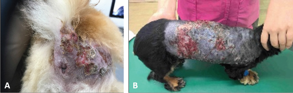 Fig. 1. Dorsal distribution of the skin lesions in both cases. (A): Lesions around the buttocks in case 1. (B): Lesions on the dorsum in case 2. The lesions appear multifocal, irregular, erythematous to haemorrhagic, alopecic papules, plaques, and nodules, with extensive crusting, draining tracts, and ulceration.