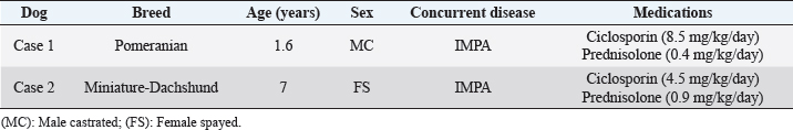 AbstractBackground: The Burkholderia cepacia complex (Bcc) is an opportunistic pathogen in humans and animals. Deep pyoderma caused by these bacteria in dogs has been previously reported. This case series aims to describe contrasting treatment responses in Bcc-related deep pyoderma in two dogs, a male and a female. Case Description: Both patients had a history of immune-mediated polyarthritis (IMPA) managed with oral ciclosporin and prednisolone. Their skin lesions were multifocal, irregular, erythematous to hemorrhagic, alopecic papules, plaques, and nodules, with extensive crusting, draining tracts, and ulceration. Cytological findings revealed a marked inflammatory response consisting of non-degenerative and degenerative neutrophils and macrophages, with moderate to abundant intracellular and extracellular Bcc. Ciclosporin and prednisolone were stopped in case 2 after diagnosis. However, it was challenging to stop the regimen in case 1 because of the recurrence of IMPA and the onset of iatrogenic hypoadrenocorticism. Case 1 did not achieve remission for approximately 66 weeks even with seven protocols because of multiple relapses, whereas it took only 3 weeks to achieve remission in case 2 while using one drug. Conclusion: For deep pyoderma with extensive lesions in immunosuppressed patients, one should consider infection with Bcc. Therefore, immunosuppressants should promptly be reduced in such patients, and then, intensive antimicrobial therapy may achieve remission. Keywords: Burkholderia cepacia complex, Deep pyoderma, Immunosuppressant, Dogs. IntroductionThe Burkholderia cepacia complex (Bcc) represents a group of motile, aerobic, glucose-nonfermenting gram-negative rods. These bacteria are ubiquitous in the natural environment and can be isolated from water, soil, fruits, and vegetables (Compant et al., 2008). Bcc organisms have emerged as important opportunistic pathogens in hospitalized (i.e., nosocomial infection) and immunocompromised patients and have been associated with contaminated disinfectants, hospital tap water, intravenous solutions, and medical devices (Nasser et al., 2004). In previous reports, Bcc-related deep pyoderma in dogs was successfully treated in a relatively short period with antimicrobials (Banovic et al., 2015; Cain et al., 2018). The objective of this case series is to describe different treatment responses in Bcc-related deep pyoderma in two dogs. Case DetailsThe signs and historical data of the two dogs are summarized in Table 1. Patient 1 was a castrated male, and patient 2 was a spayed female. Both patients had a history of immune-mediated polyarthritis (IMPA) managed with oral ciclosporin and prednisolone. Both dogs developed skin lesions within 4–5 months of starting ciclosporin. Skin lesions were initially dorsally distributed in both dogs, particularly in the buttocks area in case 1. These lesions were multifocal, irregular, erythematous to hemorrhagic, alopecic papules, plaques, and nodules, with extensive crusting, draining tracts, and ulceration (Fig. 1). Skin cytology in both dogs revealed a marked inflammatory response consisting of non-degenerative and degenerative neutrophils and macrophages, with moderate to abundant numbers of intracellular (neutrophils and macrophages) and extracellular rods (Fig. 2). These rod-shaped bacteria were identified as Bcc in a diagnostic laboratory. We axenically collected culture samples from non-ruptured comedones by fine-needle aspiration. After isolation and culturing with the rod-shaped bacteria, these samples were examined by a Matrix-assisted laser desorption/ionization-time of flight mass spectrometry imaging technique (MALDI Biotyper System, Bruker Corporation, Billerica, MA) in a commercial diagnostic laboratory (Sanritsu Zelkova, Chiba, Japan). As these mass spectrometry data matched B. cepacia, we diagnosed Bcc-related deep pyoderma. Table 1. Signalment and historical features of two dogs with Bcc-related deep pyoderma.