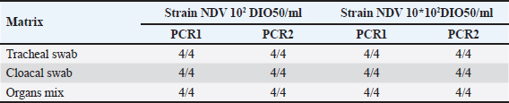 The detection limit was determined for individual samples and up to five pooled samples for each matrix. Preparations of a pool of five at the detection limit For each type of analytical matrix, we diluted the NDV 108 DIO50/ml strain 10-fold in Phosphate-Buffered Saline (PBS) supernatant of negative samples to obtain a suspension at the previously determined detection limit. Then, we further diluted this suspension1/5 in PBS supernatant of negative samples and processed it as described above. Intra-y and inter-assay repeatabilityThe CV was calculated by dividing the standard deviations of the samples by the mean of the cycle threshold values and multiplying the result by 100 to estimate the inter-assay and intra-assay repeatability. CVs below 10% were considered satisfactory (Vandemeulebroucke et al., 2010). Results Analytical specificityThe experimental analytical specificity of the ID Gene™ Newcastle Disease Duplex kit was verified in terms of inclusivity and exclusivity. All selected NDV strains were scored positive regardless of their genotype, confirming that the ID Gene™ Newcastle Disease Duplex kit allows the detection of Moroccan NDV strains, as well as other NDV genotypes. Samples of other orthomyxoviruses were negative at PCR, excluding cross-reactivity with highly pathogenic avian orthomyxoviruses, such as influenza A virus subtypes H5 and H7 (Table 2). Analytical sensitivityLimit detection to be checked The analytical sensitivity was determined for each type of matrix (tracheal swab, cloacal swab, and tissues) and for the extraction method (NucleoSpin® RNA Virus, Macherey-Nagel). For this purpose, pools of PBS supernatants of each type of matrix were formed. We performed extractions using the extraction kit with 150 µl of each dilution of Strain NDV 10 DIO50/ml to Strain NDV 107 DIO50/ml, adding exogenous Non-target positive control (NTPC) from the ID Gene™ Newcastle Disease Duplex kit. After assessing several NDV dilutions, the analytical sensitivity was checked for each matrix and for each extraction method, as the last dilution point at which a positive Reverse Transcription Polymerase Chain Reaction (RT-PCR) result was obtained, was 102 and 103 IOD50/ml for individual and pooled samples of five, respectively. Limit of detection for individual samples With the NucleoSpin® RNA Virus kit (Macherey-Nagel), the validated limit detection method for individual samples was “NDV 102 DIO50/ml” for tracheal and cloacal swabs, as well as for organs (Table 3). Limit detection in pools of five samples With the NucleoSpin® RNA Virus kit, MachereyNagel, the validated “LDMethod for pools is “NDV 102 DIO50/ml” for tracheal and cloacal swabs, as well as for organs (Table 4). Intra-assay and inter-assay repeatabilityThe intra-assay repeatability was between 2% and 4% and 1% for 102 and 103 DIO50/ml, respectively. The inter-assay repeatability was 3% and 1% for 102 and 103 DIO50/ml, respectively. The results are considered satisfactory. Table 2. Strains used to test inclusivity and exclusivity.