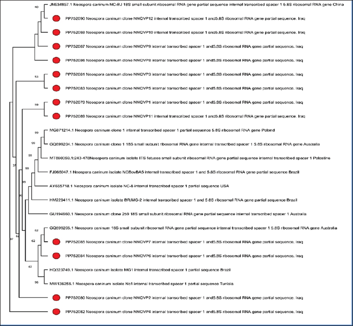 Fig. 3. Phylogenetic tree analysis of Neospora caninum from infected cattle based on PCR-amplified 5.8S ribosomal RNA gene. (PP752079, PP752080, PP752081, PP752082, PP752083, PP752084, PP752085, PP752086, PP752087, PP752088, PP752089, and PP752090). The local strains were subjected to bioinformatics analysis, and their phylogenetic tree was drawn (Fig. 3) to compare with the global strains. It was found that there is a similarity (97%–99%) with global isolates from China, Poland, Australia, Palestine, Brazil, the USA, and Tunisia. DiscussionThe intracellular protozoan parasite N. caninum is found all over the world. Neosporosis exhibited the following prevalence rates 10.7% to 19.6% in Africa (Ghalmi et al., 2012; Ibrahim et al., 2012), 5.7%–43% in Asia (Koiwai et al., 2006; Nazir et al., 2013), 0.5%–27.9% in Europe (Bartels et al., 2006; Imre et al., 2012), and 7.6%–76.9% in America (Sousa et al., 2012; Cedeão and Benavides, 2013). In China, Yi et al., (2024) recorded that IgG was found in 2.1% (21/985) of cattle. In Egypt, Ragab et al. (2024) recorded that 13.2% of the tested animals were positive to N. caninum. In central India, Hebbar et al. (2022) showed the presence of 24.8% (143/576) in the tested animals. Neosporosis can be a main reason for financial loss for livestock producers especially in the cattle sector (Dubey et al., 2007, Reichel et al., 2013). Neosporsis’ influence on animals is still unveiled in certain regions worldwide. In this context, some regions in Iraq like Al-Diwaniyah, were selected to determine the prevalence of N. caninum among cattle. Moreover, the aim of the research was to detect the infection of N. caninum, the common cause of abortion in cattle within the Iraqi region of Al-Diwaniyah. Cattle was selected as a major source for meat production, so the reproductive loss in this livestock would be disastrous. Furthermore, the choice of a reliable, reproducible, and cost-effective approach is an issue of paramount importance in diagnostics filed for the animal reproduction sector. The review of literature addressed a plethora of reports concerning the seroprevalence and molecular prevalence of N. caninum in animals applying either a single approach or dual approaches. Regarding the seroprevalence of N. caninum in cattle, our finding was 7.5%. Al-Gharban et al. (2017) from Middle Iraq determined the prevalence of antibodies to N. caninum in bovines with prevalence 27.22%. In 2019, a previous study conducted in north Tanzania on 3,015 cattle serum samples showed a seroprevalence of N. caninum of 21.5% using indirect ELISA-antibodies against the parasite (Semango et al., 2019). A study conducted in Sudan reported that antibodies against N. caninum were detected in 9.2% in females, while in males the positive infection rate was 1.5% (Ibrahim et al., 2012). In Mexico, Garcia-Vazquez et al. (2009) also documented a higher seroprevalence of N. caninum in Heifers-cows (11.8%) were more infected than bulls (5.6%). A recent study conducted in Iran has shown a seroprevalence percentage of 3.9%, with infection rate in >2-year-old bulls higher than ≤ 2-year-old (Gharekhani et al., 2023). In another study conducted in Pakistan in 2013, a high seroprevalence of neosporosis (43%) was recorded in cattle, and seroprevalence percentage of 47 and 55% among 2-year-old cattle and crossbreds, respectively, was noted (Nazir et al., 2013). In Romania in 2012, a seroprevalence of 27.7% neosporosis was observed without a statistical correlation of neosporosis in relation to age (Imre et al., 2012). In 2019, other previous study conducted in Kenya revealed a seroprevalence of neosporosis of 25.6% (Okumu et al., 2019). A recent study conducted in Egypt showed a high seroprevalence of neosporsis among cattle at 28.89% (Selim et al., 2023). Another study in Egypt has reported a total seroprevalence of 30.04% in cattle (Gaber et al., 2021). The result of the current research was in agreement with Mallah (2012) who reported a high seropositive percentage from March to June (20.576 %) and a low seropositive percentage from July to October (14.285%). Rinaldi et al., (2005) in southern Italy revealed that significantly high seroprevalence to N. caninum in cattle was recorded in spring. Talafha and Al-Majali (2013) in Jordan, documented infection rates among dairy herds and identified significant monthly differences related to serologic responses at 35% and 66.5 % during January and June, respectively. Similarly, a discrepancy among various studies regarding the molecular detection of N. caninum in cattle. For instance, 13.6% molecular prevalence was detected in Iran (Gharekhani et al., 2022). A recent study, conducted in Kurdistan region-Iraq, has showed the molecular prevalence of N. caninum of 20.6% and 17.9% among sheep and goats (Mohammed et al., 2023). A previous study had detected the presence of N. caninum in sheep in Brazil using PCR (Pena et al., 2007). The PCR’s greater specificity in detecting the parasite’s DNA might be more indicative of a live infection (Sager et al., 2006). Frössling et al. (2006) and Borsuk et al. (2011) found high sensitivity and specificity of ELISA in detecting the parasite. The inherent 75% sensitivity of the PCR test is in line with other studies that have recorded sensitivities of 70%–90% (Otranto et al., 2003; Collantes-Fernãndez et al., 2008). It is evident through these outcomes that more than one test is needed to diagnose N. caninum in a cow with good sensitivity and specificity. Therefore, ELISA as an infection screening test is recommended, but because of its low sensitivity and the risk of false positives, it should later be confirmed by a more specific test such as PCR (Dubey et al., 2007). High genetic variance in N. canninum could be essential to assay the rate of evolution and dispersal of the parasite and develop region-specific intervention programs to minimize the danger of the parasite. Comparison with a large number 