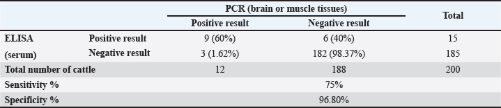 The results were also evaluated as follows: S/P ≥ 50% and S/P ≤ 40 are considered as positive and negative, respectively. Molecular investigation of N. caninumGenomic DNA isolation Genomic DNA from the tissue samples: the brain and muscles were isolated using a DNA isolation Kit (Geneaid/ New Taipei City, Taiwan) according to the manufacturer’s instructions. The DNA obtained from the extraction process was evaluated for quality and quantity using a NanoDrop. The target DNA was positioned in a 1.5 ml Eppendorf tube and kept in –20°C storage. 5.8S rRNA primer setThe polymerase chain reaction (PCR) primer pair utilized for the identification of N. caninum were designed Primer3 and the NCBI websites. The primer sequences were NS-F-5ˊATTTATTCCTATATTA-3ˊ and NS-R-5ˊGGGCTTTACATACTACTACG-3ˊ.. PCRThe PCR had been performed in a total volume of 50 μl. The reaction mixture consisted of 6 μl DNA template (100 ng), 25 μl 2 × EasyTaq® PCR Super Mix, 3 μl forward primer, 3 μl reverse primer, and 15 μl nuclease-free water. The PCR conditions in the PCR thermocycler (Techne, Ramsey, MN) were set as follows: Initial denaturation: 95°C, 5 minutes, 30 cycles: Each cycle: Denaturation: 94°C, 30 seconds, Annealing: 50°C, 30 seconds, Extension: 72°C, 30 seconds, and a final extension of one cycle at 72°C for 10 minuted. After the termination of PCR, the PCR product was evaluated by 1% agarose gel electrophoresis. The expected PCR product of 236 bp was visualized using a UV-transilluminator. Statistical analysisThe obtained datum was exposed to a chi-square test to assess the various parameter values impacting the infection rate, with statistical significance specified at (p≤0.05) and (p≤0.01) levels (SAS, 2012). Ethical approvalIn this study, no live animals were harmed, as all samples were collected from animals that had already been slaughtered for commercial purposes. The handling of these samples strictly followed relevant national or institutional guidelines for biosafety and ethics. To protect privacy, all samples were anonymized to ensure that the identity of both the source locations and the animals was protected. Confidentiality was maintained throughout the process, and results were reported in a way that guaranteed anonymity for the businesses and animals involved. Participation in the study was voluntary, and shop or slaughterhouse owners/managers could refuse permission for sample collection without any consequences. Additionally, stringent biosafety protocols were followed to ensure the safety of all personnel and prevent contamination during sample collection. Table 1. Infectivity percent of N. caninum in cattle according to sex and age by ELISA.