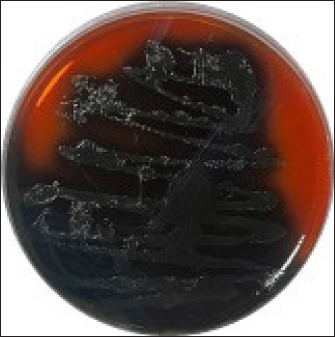 Fig. 1. Colonies of LM presented on PALCAM agar. Colonies are unable to ferment mannitol or hydrolyze esculin when LM is present. Rather, they have a black halo and a gray-green appearance.
