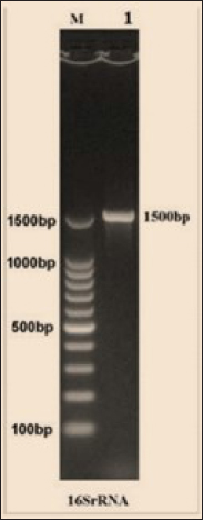Fig. 3. The final result of the PCR sample. Results of a 1% agarose gel electrophoresis fractionated using an Eth. Br. M: 100 base pairs ladder marker to show the amplification of the 16s RNA gene of an unknown bacterial kind. Lane 1 resembles PCR products consisting of 1500 base pairs. IL-1β concentrationThe IL-1β displayed a significant difference (p < 0.05) at day 7 in pre-challenge groups of animals G3 and G4 (29.58 ± 0.98 and 27.31 ± 0.88), respectively, in addition at day 28 in the post-challenge with virulent LM groups G2–G4 (52.9 ± 1.78, 24.95 ± 1.05, and 23.77 ± 0.98) separately, in comparison with the control negative G1 that was (10.9 ± 1.57 and 12.7 ± 0.88) at days 7 and 28, respectively. However, no significant difference between G3 and G4 at 7 or 28 days, in common with day 0 among all groups (10.5 ± 0.82, 10.3 ± 1.38, 9.7 ± 0.99, and 8.9 ± 0.9) as in Table 3 and Figure 7. IgG3 concentrationThe IgG3 presented significant alteration (p < 0.05) at day 14 in pre-challenge groups of animals G3 and G4 (12.07 ± 0.38 and 11.29 ± 0.48), respectively, as well as after day 28 in the post-challenge groups G2–G4 with virulent LM (12.76 ± 0.79, 6.48 ± 0.57, and 4.43 ± 0.58), respectively, in comparison with the control negative G1 (1.54 ± 0.19 and 1.24 ± 0.25) at days 14 and 28, respectively, but no alteration in day 0 among all groups (1.39 ± 0.43, 1.26 ± 0.26, 1.53 ± 0.18, and 1.45 ± 0.12) as in Table 4 and Figure 7. Histopathological studyThe central nervous system is a specific tropism for LM (Remuzgo-MartÍnez et al., 2013). The control positive group showed that LM congestive of blood vessels (BVs) with erythrocytes and early polioencephalomalacia, the perivascular accumulation of protein-rich fluid, and minor hemorrhage with micro-abscess resulted in a significant increase in the total number of aggregation inflammatory cells in the ventricles of the brain. WKLMAgs and LCFPs groups revealed mild injury in brain tissue as a result of encouraging a preventive humoral immune response against intracerebral infection (Sunden et al., 2010) as in Figure 8A, C, and D. However, the groups of WKLMAgs showed congestion of BVs in the cortex with nonedematous parenchyma (Fig. 8C), whereas LCFPs displayed that the normal structure of the ventricular area of the brain is lined by a simple cuboidal epithelium (SCP) with no periventricular edema in the white pulp (Fig. 8D). Table 1. The level of immunoglobulin M (mg/ml) in immunized and challenged groups by virulent LM at days 0, 7, and 35 in serum.