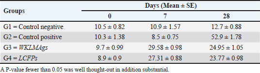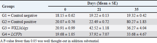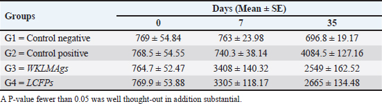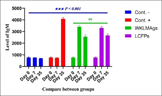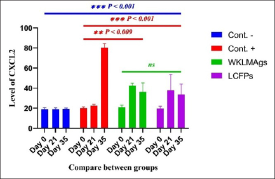 Fig. 4. The pre- and post-challenge statistically significant IgM between the groups demonstrated significant variance p < 0.001 at day 7 in pre-challenge groups of animals G3 and G4, respectively, as well at day 35 in post-challenge with virulent LM groups G2–G4 correspondingly, compared with the control negative G1. No significant difference between G3 and G4 at 7 or 35 days, alongside at day 0 between all groups. Cont. −=G1, Cont. −=G2, WKLMAgs=G3, and LCFPs=G4. Two-way ANOVA was used to compare between more than two groups with significant changes in mean total cell (*p < 0.05, **p < 0.01, and ***p <0.001; ns: not significant). Table 2. The level of CXCL2 (mg/ml) in immunized and challenged groups by virulent LM at days 0, 21, and 35 in serum.