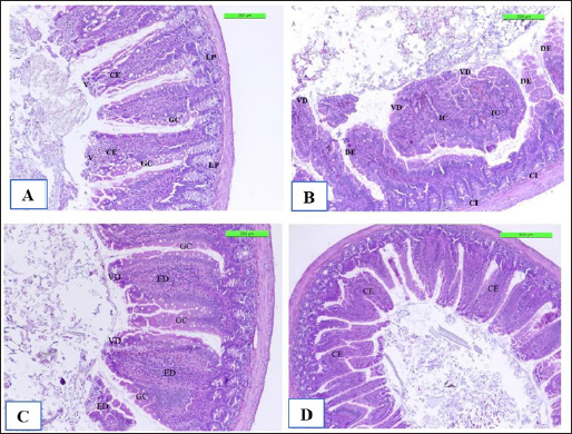 The positive control showed microgranuloma, encircled by typical hepatic cell cords, comprised of a buildup of monocytes with congestion (Fig. 10B) differs from (Fig. 10A) of Cont. −=G1 group. However, the hepatic section of WKLMAgs appears normal, with organized hepatocytes establishing radiating hepatic cords about the central vein and portal structures, but the hepatic tissues include a slightly dilated blood sinusoid. There were no inflammatory cells in the portal area or the parenchyma, but a proliferation of Kupffer cells (Fig. 10C). Furthermore, the liver shows a central vein at the center of the lobule. Hepatocytes radiate externally from the central vein, split by sinusoidal capillaries and maintained by reticular fibers, with the spread of Kupffer cells in the sinusoids in the LCFPs group of Figure 10D as in Figure 10A. Even though the monocytic cells infiltrated in the submucosa of the small intestine, leading to focal ulcerative enteritis ranging from mild to severe, accompanied by the shedding of mucosal cells into the intestinal lumen in (Fig. 11B) in the Cont. + group. While the lesion of the small intestine in the WKLMAgs group shows the absence of aggregations of lymphocyte cells within the lamina propria with an increased number of goblet cells, the planning of intestinal epithelial cells is disordered in Figure 11C comparable in Figure 11A. Furthermore, lesions of the group LCFPs appear significant in columnar surface epithelial cells of the small intestine that are systematized in centers to yield a form of villi, mucin-secreting goblet cells mixed in the epithelium with no aggregation lymphocyte cells in lamina propria (Fig. 11D) analogous in Figure 11A.