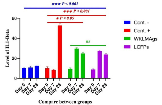 Fig. 6. The pre- and post-challenge statistically substantial IL-1β among the groups presented notable variation p < 0.001 and p < 0.05 at day 7 in pre-challenge groups of animals G3 and G4, respectively, moreover at day 28 in the post-challenge groups G2–G4 with virulent LM separately, compared with the control negative G1 at days 7 and 28. No substantial difference between G3 and G4 at 7 or 28 days, in common with day 0 among all groups (Cont. −=G1, Cont. −=G2, WKLMAgs=G3, and LCFPs=G4). Two-way ANOVA was used to evaluate significant changes in mean total cell (*p < 0.05, **p < 0.01, and ***p <0.001; ns: not significant). Table 3. The level of IL-1β concentration (ng/ml) in the groups of rats challenged with virulent LM and immunized at days 0, 7, and 28 in serum.