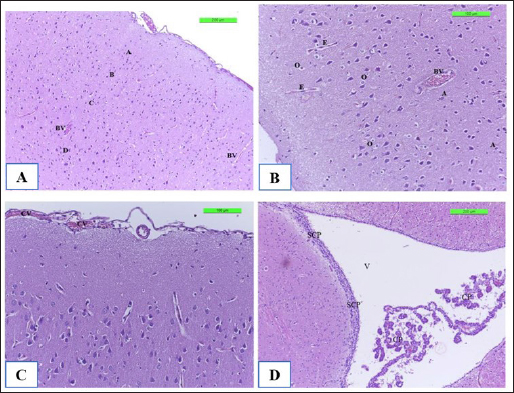 Fig. 8. The H&E staining sections of histopathological brain groups; the section (A) of Cont. −=G1 group showing the pyramidal neurons (A), outer pyramidal cell (B), internal pyramidal cell (C), bigger pyramidal neurons (D), and BVs X10. The section (B) of the Cont. +=G2 group viewing the cerebral hemispheres appears congestion of BVs with perivascular edema (E) with hypertrophy of astrocytes (A) and oligodendrocytes (O) X20. The section (C) of the WKLMAgs=G3 group displays the lesion of the cerebral showing congestion of BVs, with normal structure of cerebral X20. The section (D) of the LCFPs=G4 group showing the lesion of the cerebral shows the normal structure of ventricular (V) and lined by a SCP and choroid plexus X10. DiscussionThe majority of natural antibodies are IgM antibodies, which are considered the first class of antibodies to be generated during a primary antibody response against any protein or pathogen (Boes, 2000). Furthermore, class switch recombination occurs after binding to the antigen to express the CD/40 ligand on its surface, which promotes interleukin and cytokine production (Alao et al., 2019). The previous findings on vaccination with whole cells or CFPs that were killed with formalin, which likewise showed the greatest serum antibody titer of IgM, providing strong support for this outcome (Arijo et al., 2004) as this study. In contrast, individuals with IgM deficiency may exhibit clinical some symptoms when they are not asymptomatic, such as invasive or recurring infections, atopy, and autoimmunity (Gupta and Gupta, 2017). Baker et al. (2004) demonstrated that for every conjugation, the predominant immune response isotype was IgM with safe and immunogenic in adult health. Additionally, TB patients’ IgM is firmly bound to the protein, and patient sera with anti-HBHA IgM antibodies prevented M. tuberculosis from attaching themselves to and invading epithelial cells (Shin et al., 2006), and during the trial, there was no further significant immunostimulant (Table 1 and Fig. 5). While the investigation found a substantial increase in the level of IgM in the control positive groups (4084.5 ± 127.16) compared with G1, G3, and G4, corresponding with (Vernel-Pauillac et al., 2021), as they pointed in their study that mice, which inoculated with the pathogenic bacteria, have maintained high levels of IgM, and compared with other groups G1, G3, and G4 at day 35, reported by Pates et al., (2020) consider the first class of multifunctional, evolutionary conserved antibodies to be created during a primary immune response are called IgM antibodies, which are essential for the early establishment of humoral defense against invasive pathogens. Nevertheless, decreased levels of IgM at day 35 in groups G3 and G4 then induced cellular immune responses (Schaut et al., 2019) and increased the number of long-lasting memory cells, dendritic cells, and macrophages (Beikzadeh, 2024). The results of CXCL2 revealed the high significance of CXCL2 positive control compared to other groups at day 35 attributable to performance-critical roles in the migration of macrophages, monocytes, and neutrophils (Belperio et al., 2001), which occurs due to neutrophils expressing CXCR1 and CXCR2 chemokine receptors. Moreover, CXCL1 and CXCL2 are considered two of the several chemokine ligands that activate CXCR2. In response to proinflammatory cytokines (Baggiolini, 2001). Both CXCL1 and CXCL2 genes are expressed in the islets of rodents and humans (Cowley et al., 2012). In addition to the peripheral organs targeted by LM (Théroude et al., 2021) as in Figures 9–11B. To be more precise, the vaccination with rCPdA-E first stimulated home macrophages to release chemokines such as CXCL2, which in turn attracted blood neutrophils to the immunization site (Wang et al., 2022). Furthermore, our findings demonstrate at day 21 a decreased level for the WKLMAgs and LCFPs groups, as a result of the production of CXCL1/2 in the blood, chiefly derived from neutrophils (Biondo et al., 2014) and the formation of Ig from plasma cells after immunization once challenged with Staphylococcus aureus or Salmonella Typhimurium (Zhou et al., 2022). Similarly, high concentrations of CXCL2 and IL-1β are correlated where the chemokines CXCL1 and CXCL2 are synthesized and secreted in response to IL-1β (Cowley et al., 2012) as in Figure 6. In terms of host defense, a study that has explained the initial line of host defense during the early stages of infection as fish is provided by the classic proinflammatory cytokine genes, such as TNFα and IL-1β, which are crucial in regulating the inflammatory process (Tsai et al., 2014) and here are our findings that were shown of IL-1β appeared significantly at day 7 to be upregulated after immunization by WKLMAgs and LCFPs since IL-1β is the main controller that regulates systemic responses and other inflammatory stimuli (Pulpipat et al., 2020) and decreases pathological effect as in Figures 8–11C and D and D of G3 and G4. Tahtinen et al. (2022) show that RNA vaccines and other inflammatory stimuli can regulate systemic responses by acting as an important regulator of IL-1β and IL-1ra, whereas Prantner et al. (2009) and Sahoo et al. (2011) indicated that an increased level of IL-1β in positive control because of revealed to be protecting in numerous bacterial, viral, and fungal infections and are essential mediators of cellular immune responses (Van Den Eeckhout et al., 2020), as well as IL-1β plays an important role in attracting immune cells to the site of infection (Figs. 9 and 10B) (Silvério et al., 2021). Similarly, after 24 hours of vaccination, the spleen’s production of the IL-1β gene steadily increased and peaked at more than 72 hours (Pulpipat et al., 2020). Additionally, IL-1β prevents sepsis by promoting local BMC proliferation and differentiation into CD11c−CD45RBhigh DCs at both immunological and nonimmune organs in mouse models (Guo et al., 2021). Mo