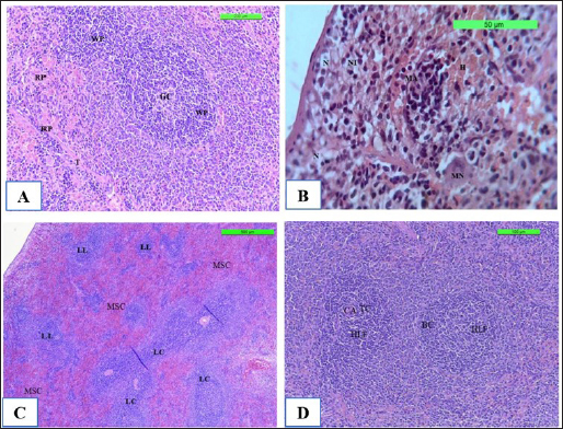Fig. 9. The H&E staining sections of histopathological spleen groups; the section (A) of Cont. −=G1 group showing a white pulp (WP), germinal center (GC), and red pulp (RP) trabeculae (T) X10. The section (B) of Cont. +=G1 group showing small micro-abscess (MA) with multinucleated giant cell (MN) around the focal aggregation of neutrophils in subcapsular region, necrosis (N) with neutrophile infiltration (NI), and hemorrhage (H) X40. The section (C) of WKLMAgs=G3 group shows the spleen exhibitions lymphoproliferative of follicle (LL) with coalescence (LC), with mild sinus congestion (MSC) X5. The section (D) of WKLMAgs=G3 group shows the spleen hyperplasia of the lymphoid follicle (HLF), activated B lymphocytes (BC), mature T lymphocytes (TC) around central arterioles (CA) X5.