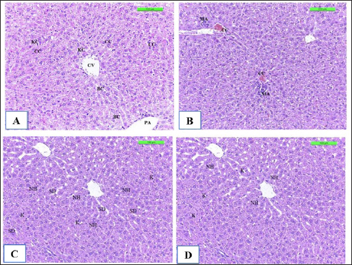 Fig. 10. The H&E staining sections of histopathological groups; the section (A) of Cont. −=G1 group showing central vein (CV), portal area (PA), cords cells (CC), Kupffer cells (KC), and bile canaliculi (BC) X20. The section (B) of Cont. +=G1 group displaying liver congestion of central vein (CC), a small micro-abscess (MA) around the central vein with proliferation of Kupffer cells in sinusoids, swelling of hepatocyte (SH) X10. Section (C) of WKLMAgs=G3 group reveals normal organization of liver hepatocytes (NH) around the central vein and portal structures, slightly dilated blood sinusoid (SD), and proliferation of Kupffer cells (K) X20. The section of LCFPs=G4 group appears normal radiated of hepatocytes of the liver (NH) around the central vein and portal structures, proliferation of Kupffer cells (K) X20.