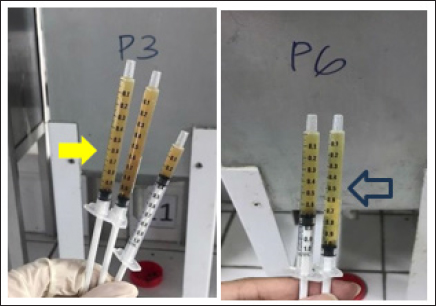 Fig. 1. Urine was collected after 24 hours of treatment from T3 and T6. Yellow arrow=urine from T3 in yellow color, blue arrow=urine from T6 in yellow color.