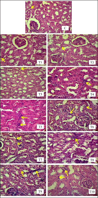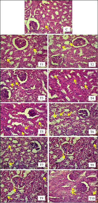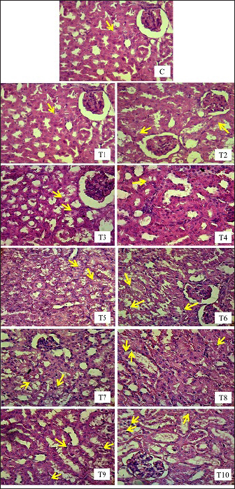 Fig. 4. Histopathological picture of renal tubular cell necrosis of male mice (Mus musculus) in each treatment with H.E staining, magnification 400x, under light microscope (Nikon Eclipse Ci) equipped with Image Raster Software Version 3.7. The yellow arrows indicate degeneration). Groups T1, T2, T3, T4, T5, T6, T7, T8, T9, and T10 showed an increase in mean rank values compared to group C. The increase in mean rank values in groups T1 to T10 was directly proportional to the increase in the dose of EG given. The histopathological picture resulting from observations of inflammatory cell infiltration in the interstitium of the renal tubules in each group can be seen in the following Figure 5. DiscussionLD50The first factor is the criteria of the experimental animals used, such as differences in species and strains, body weight, age, sex, physiology, metabolism of the body of experimental animals, and physical and psychological health conditions. Within the same species, strains play a significant role in determining the LD50 value becausse they possess different properties and gene characteristics, such that the body’s response to a toxic compound will not be the same between one strain and another (Spurgeon et al., 2020). Among various rodent species, rats (Rattus norvegicus) are more sensitive than mice (Mus musculus) to the acute and chronic toxicity effects of EG (Fowles et al., 2017). In humans, the estimated lethal dose of EG is in the range–1400–1600 mg/kg body weight (Tanasescu et al., 2014). When analyzed from these estimated lethal doses, humans are more susceptible to the acute toxicity effects of EG than other living species (Erhirhie et al., 2018). Thus, humans are by far the most sensitive to the toxic effects of EG compounds, with the safe limit set by the WHO at 0.5 mg/kg body weight per day. Mice have genes that are more susceptible to toxic effects; therefore, the LD50 values obtained are relatively smaller than those of other mouse strains (Löscher et al., 2017). Body weight affects the dose used and duration of toxic effects. Animals with higher body weights require higher doses. This is because of the greater ability of the compound to spread throughout the body (Martinez 2011). Age is related to the ability of organs to function. Young and old animals are more susceptible to toxic effects than are adults. This is because animals that are too young have imperfect organ function, whereas old animals have decreased organ function. The Mice used in this study were of optimal adult age, namely, 3 months, so they had good organ function capabilities and were fully mature. Female animals are more vulnerable than male animals because of differences in hormone activity (Fowles et al., 2017). Female animals have more fluctuating hormonal levels and experience more frequent changes and depression than male animals, which can trigger inflammation in astrocytes in the brain (Marchette et al., 2018). This is also related to the psychological and physical health of the test animals. The Mice used in this study were male; therefore, they had hormonal levels that were more stable, healthy, and not easily agitated.